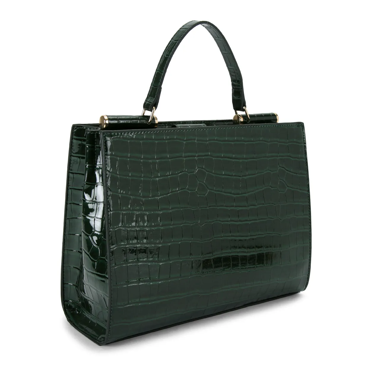- Top grab handle, adjustable strap, gold-tone hardware, logo plaque, patent croc-embossed finish