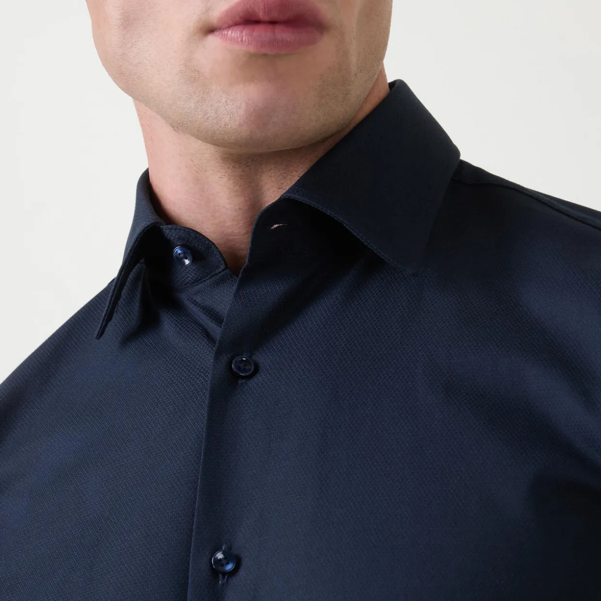 - Single cuffs, long sleeves, pointed collar, button fastenings, curved hemline, easy to iron