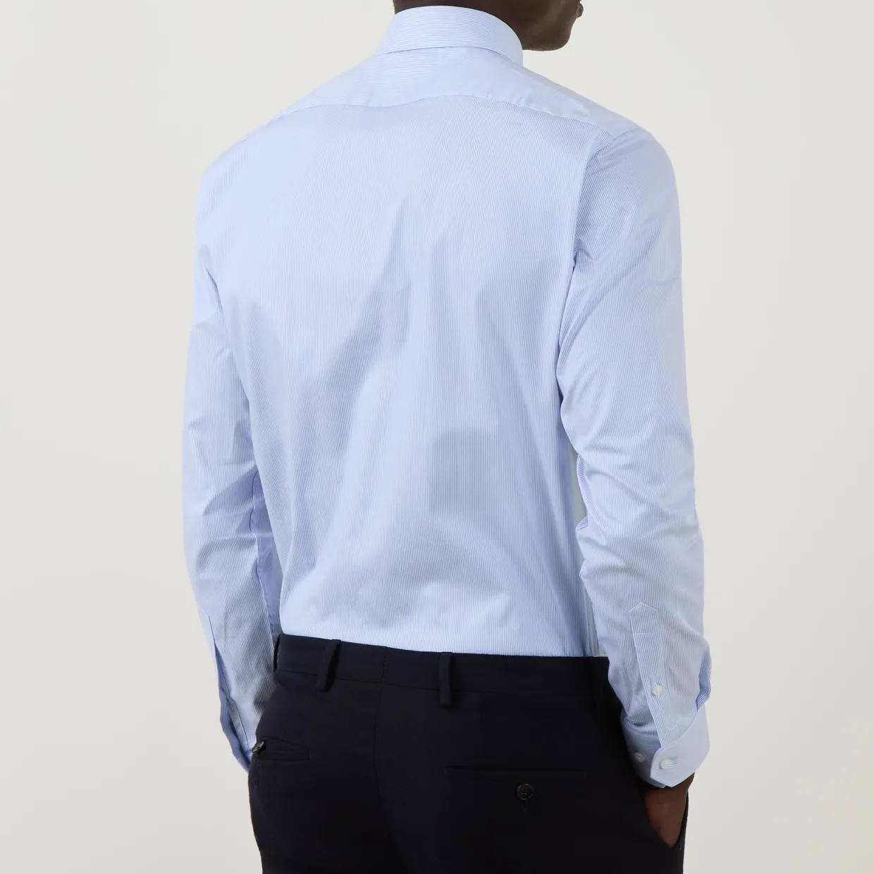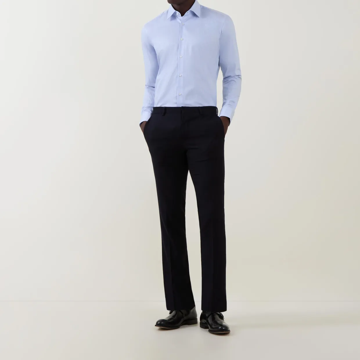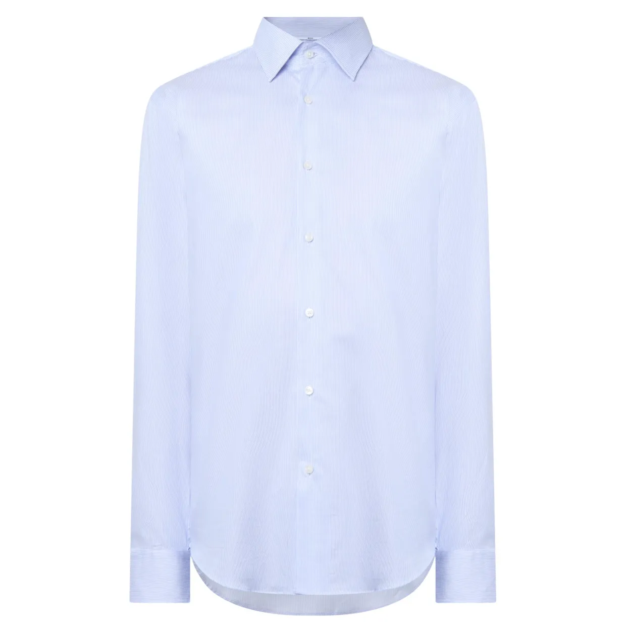 - Kent collar, long sleeves, angled button cuffs, front button fastening, curved hem, solid design, stretch fabric, easy-iron