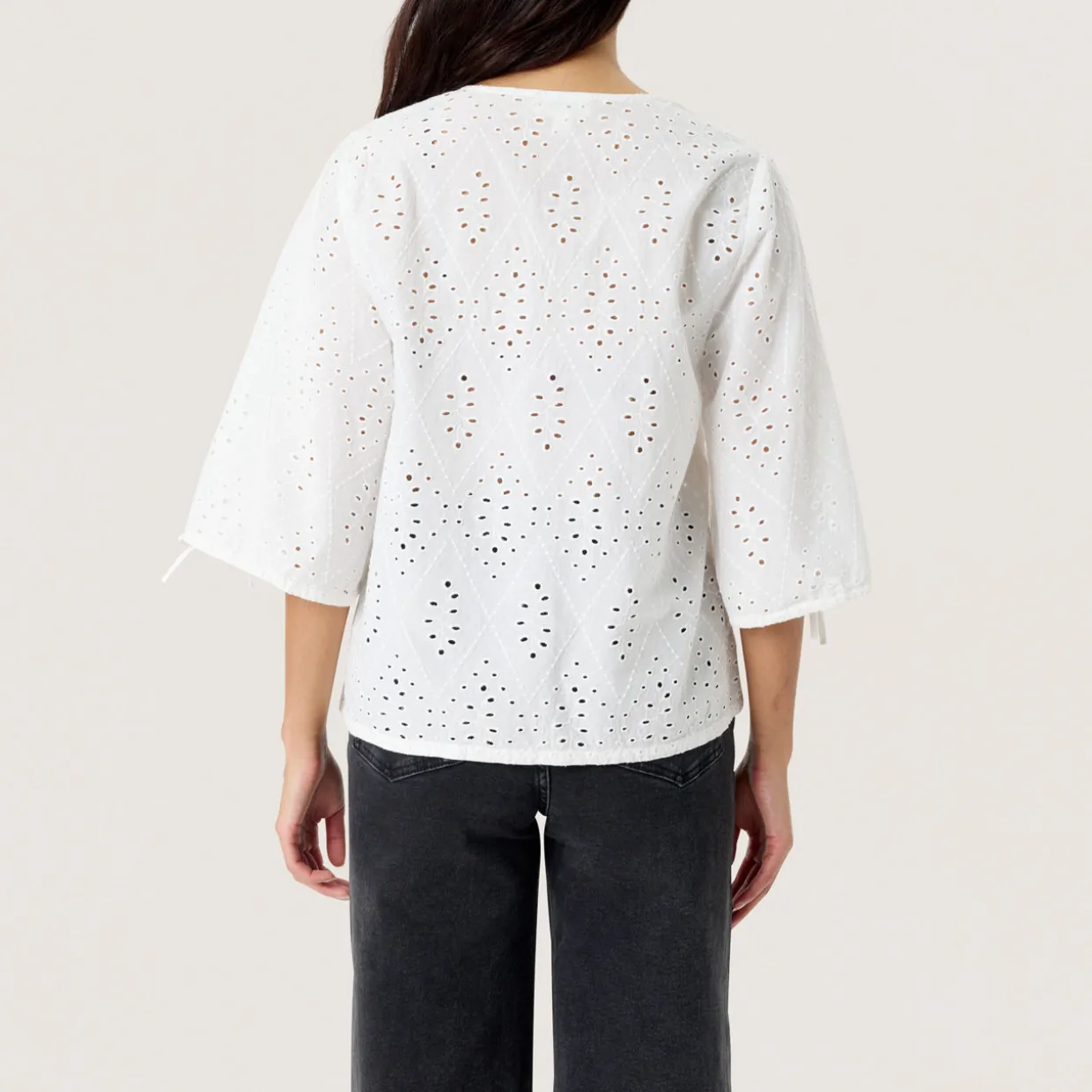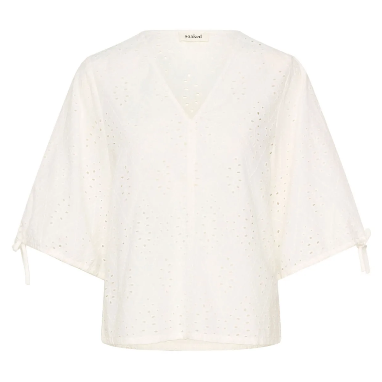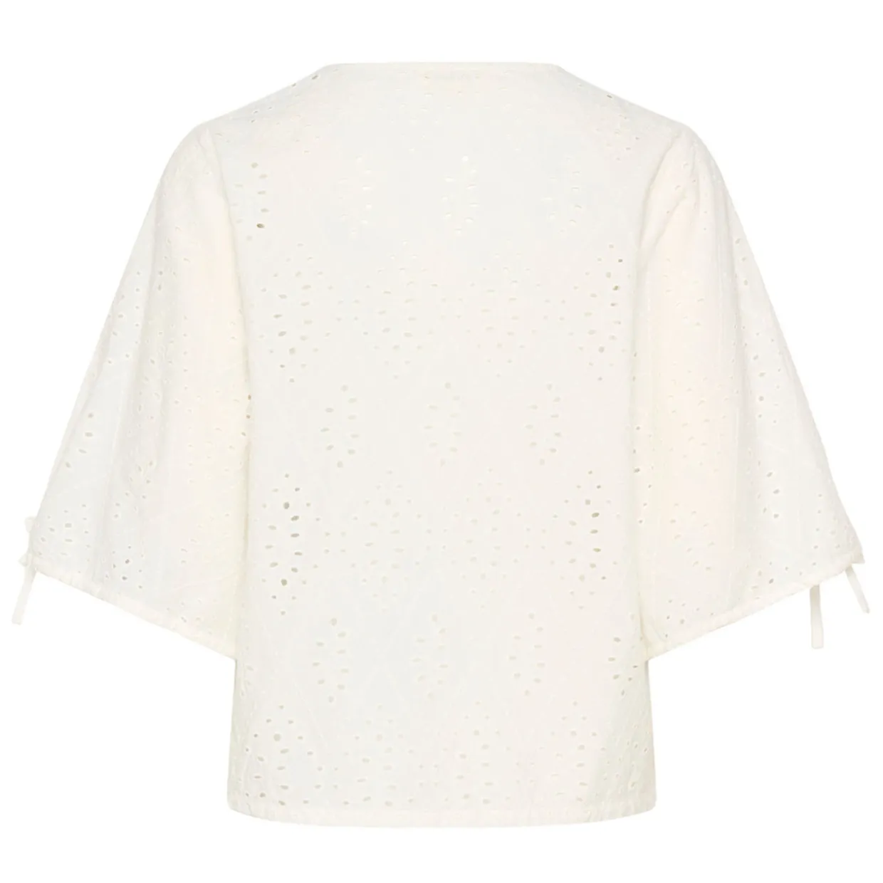 - Woven texture, three-quarter-length sleeves, V-neckline