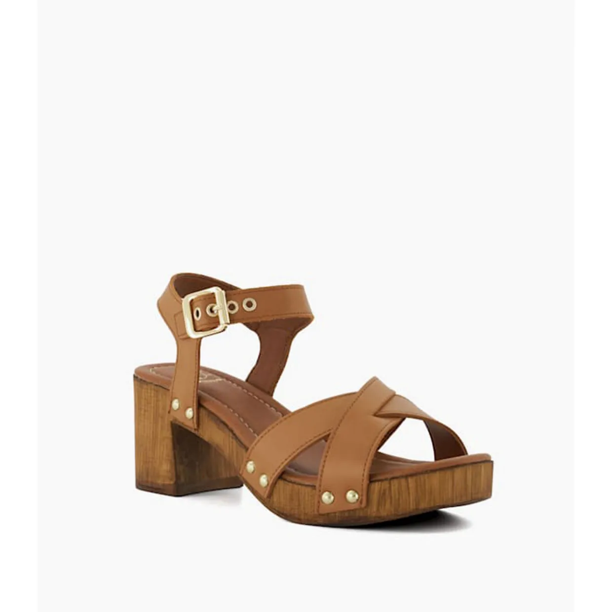 - Block heel, adjustable ankle strap with buckle fastening, crossover toe straps, open toe, gold-tone hardware, stud details