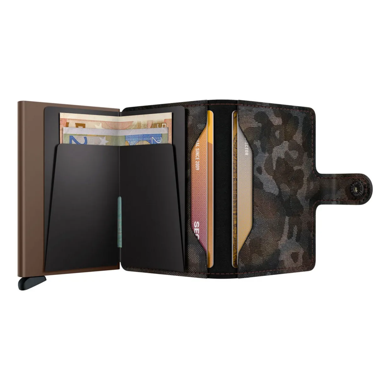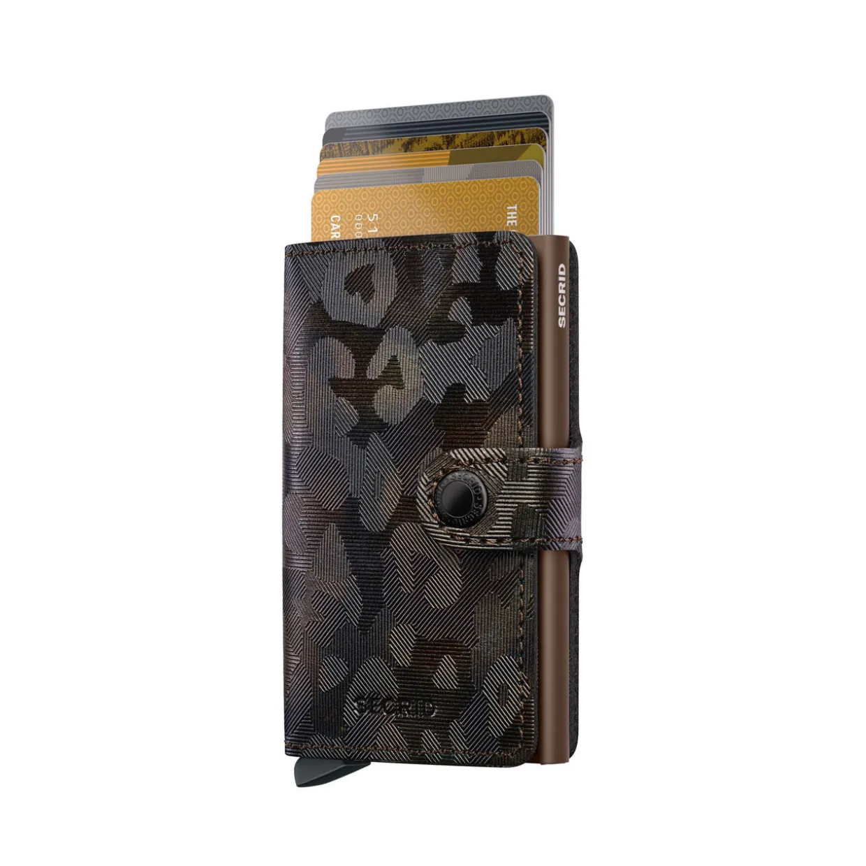 - Multi-coloured camouflage leather finish, tonal hardware, brand logo detail, fold-over button closure, aluminium Cardprotector case, slide mechanism