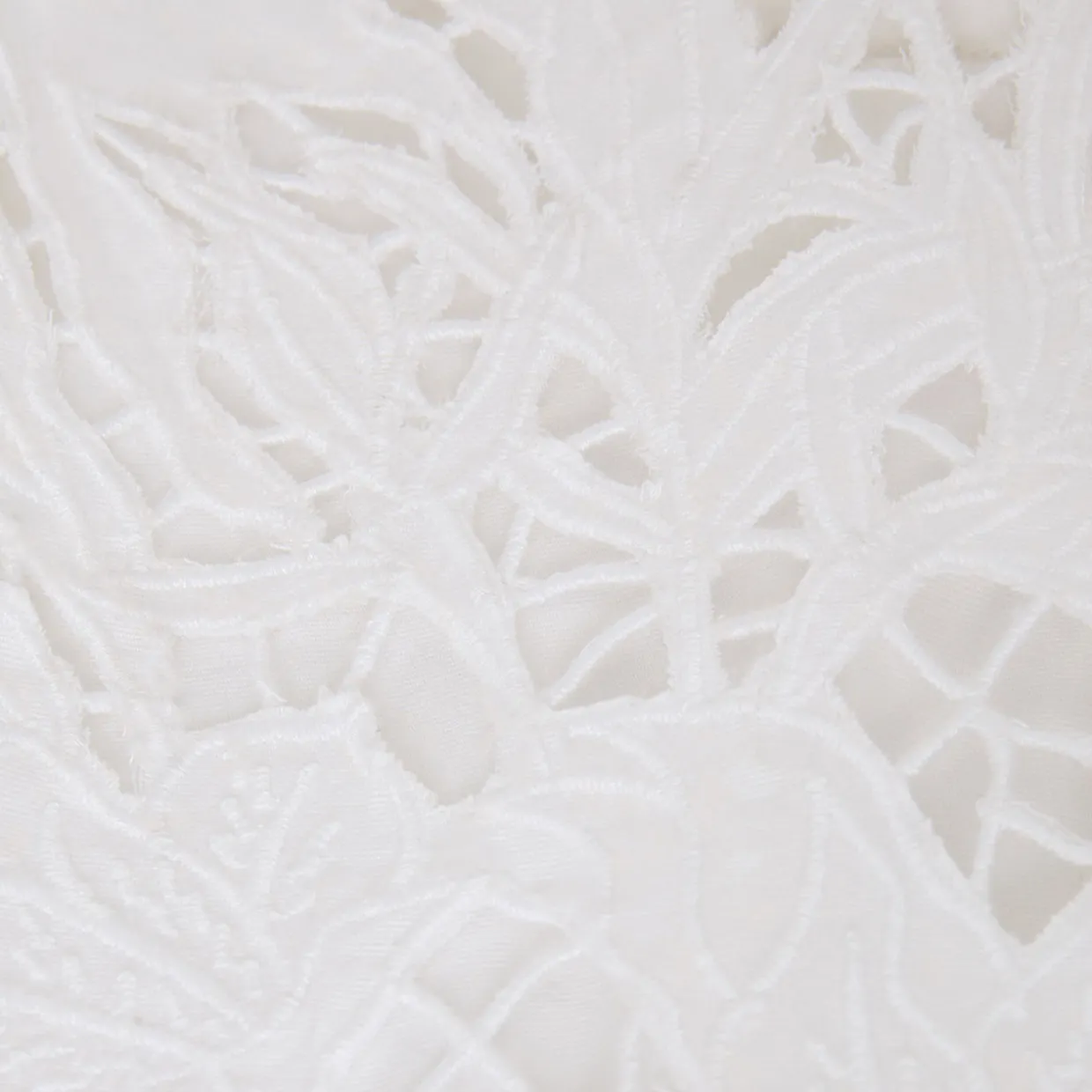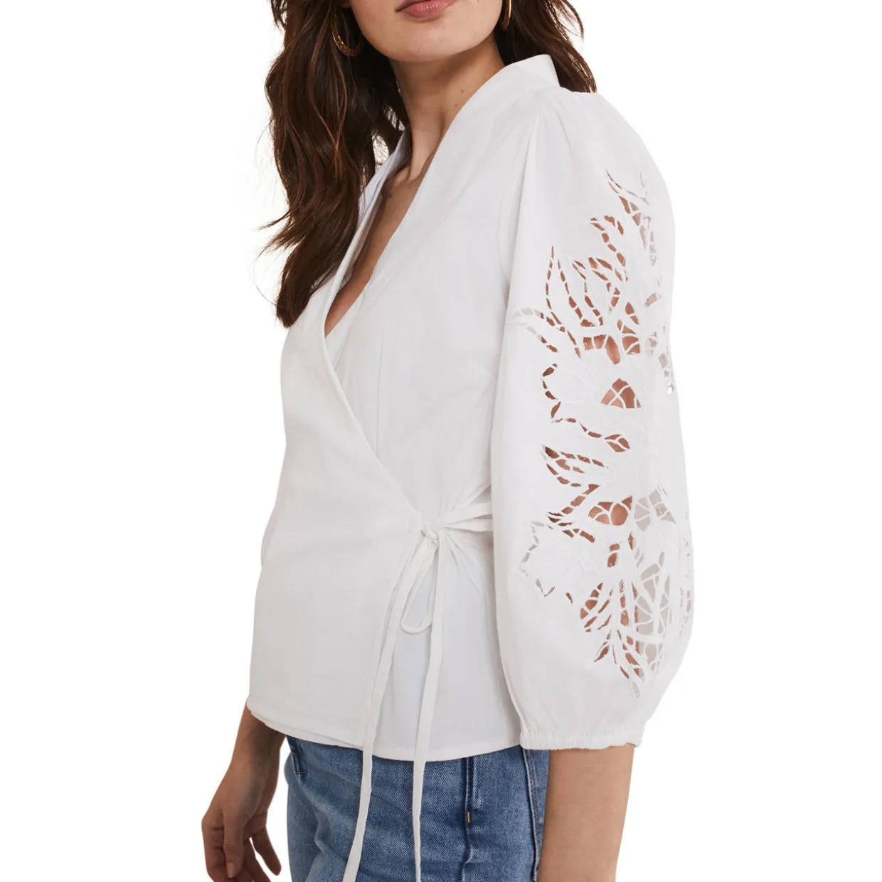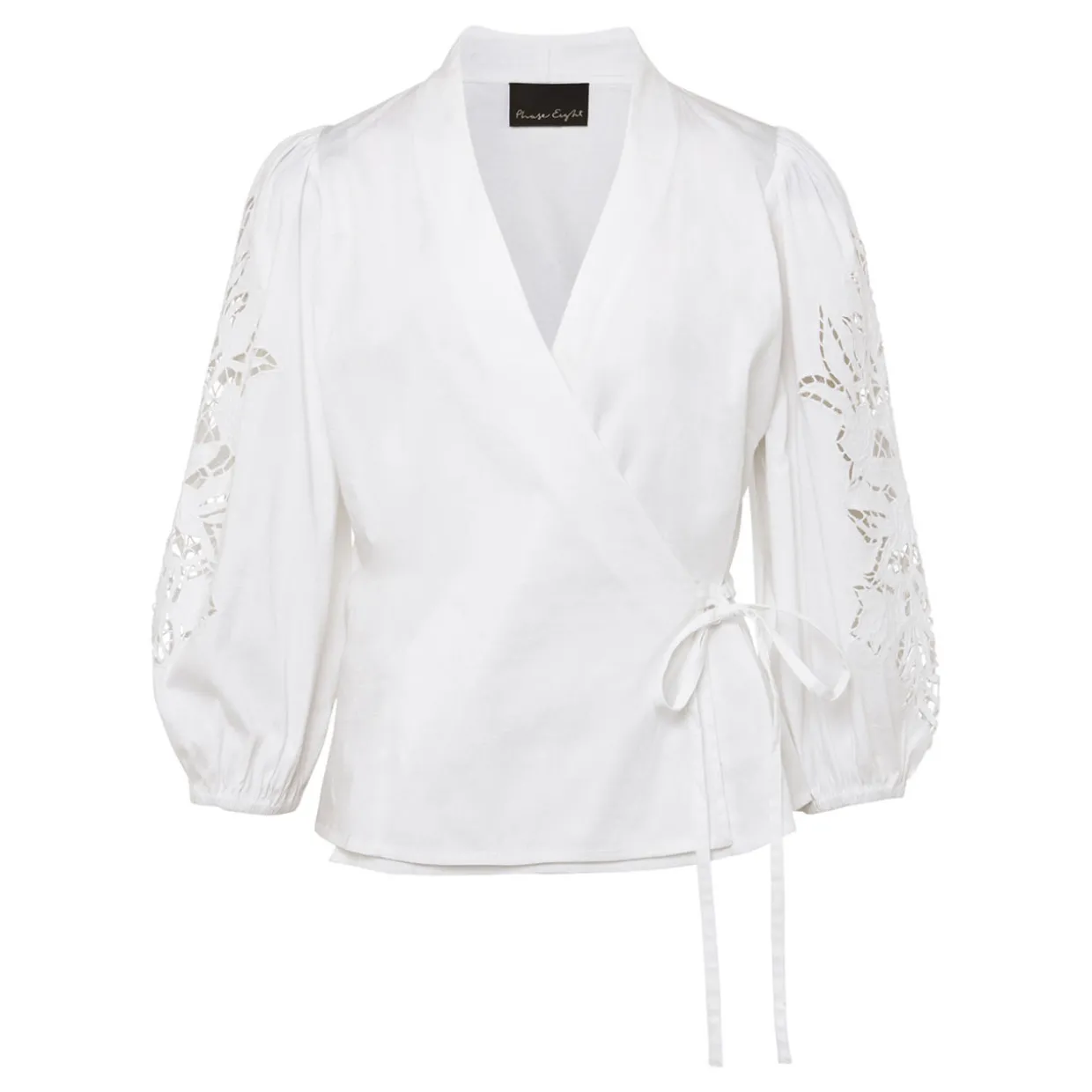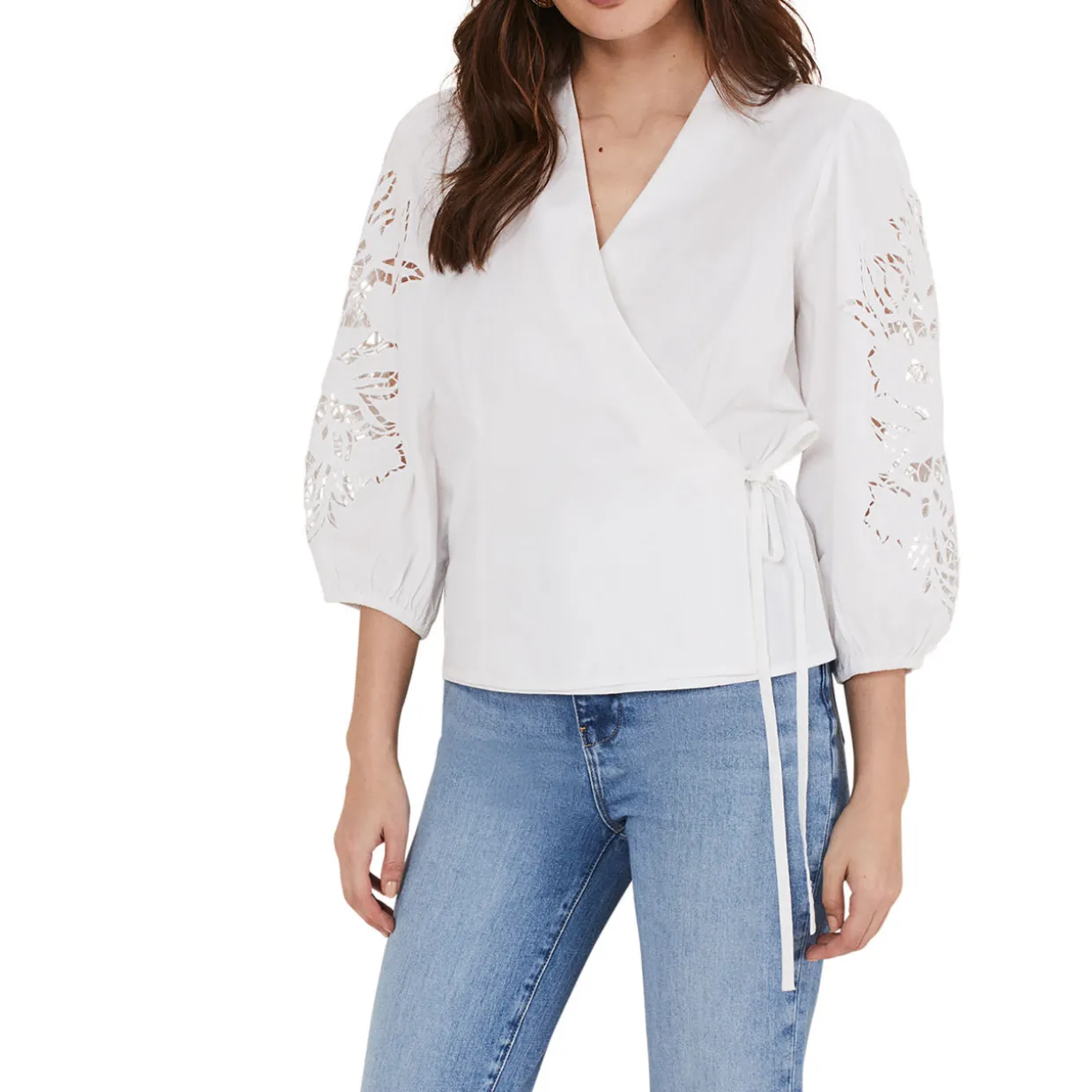 - Wrap around bodice with a tie detail at the waist, V-neckline, cutwork detail on the puffed sleeves, straight hemline, smooth fabric