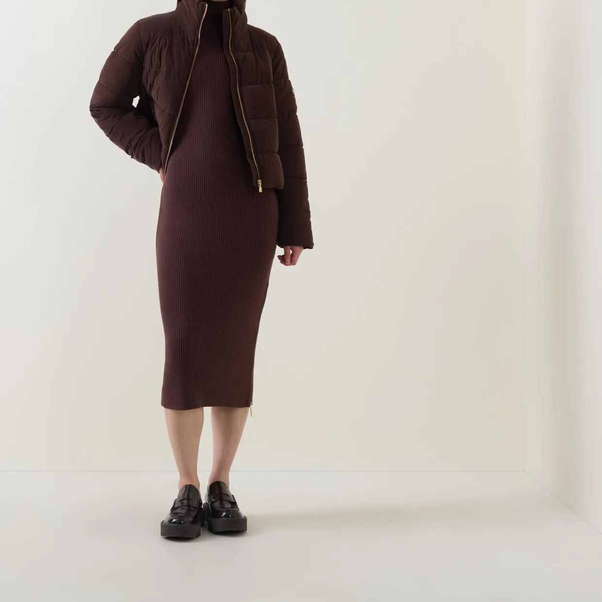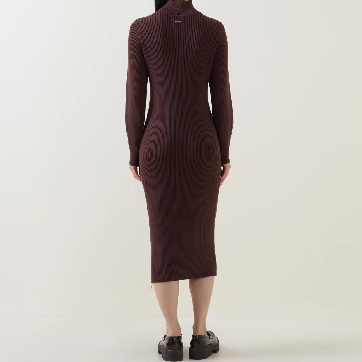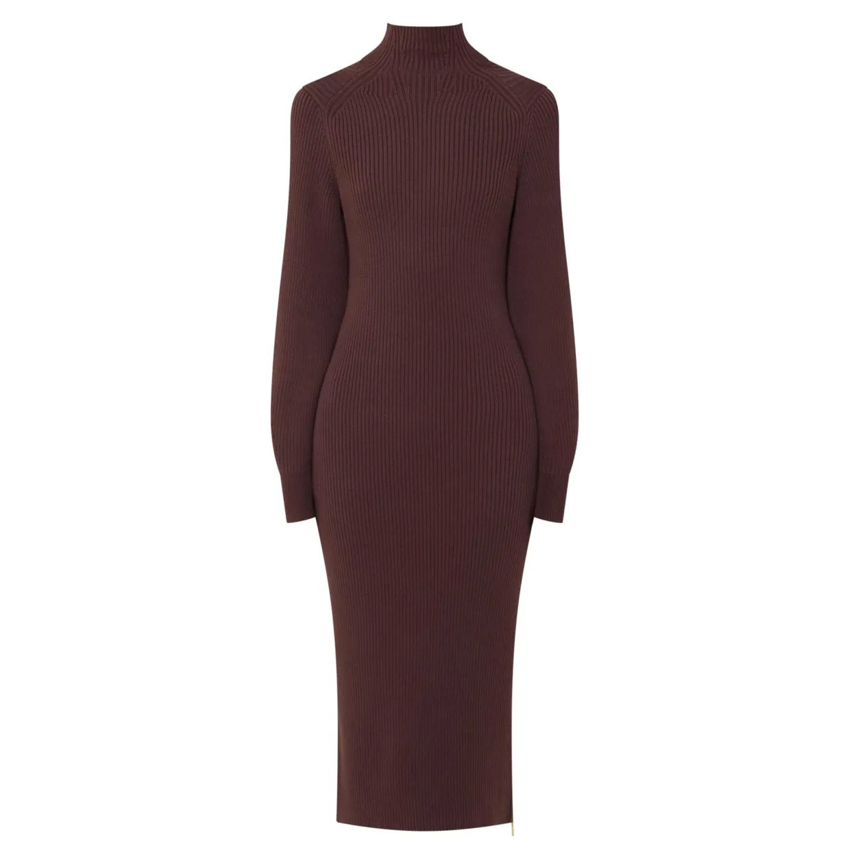 - Mock neck, long sleeves, ribbed cuffs, fitted silhouette, straight hem, side zip detailing, gold-tone hardware, rib knit construction, midi length