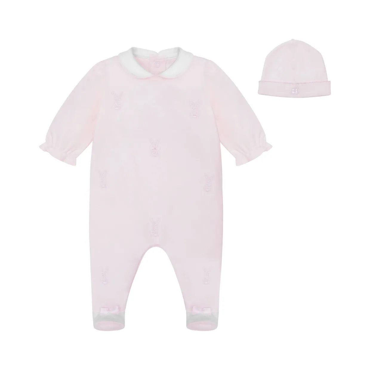 - Babygrow: Embroidered bunny details, rounded contrast collar, piped trim, satin bow detailing, frilled cuffs, snap button fastening. Hat: Embroidered bunny details, pull-on style