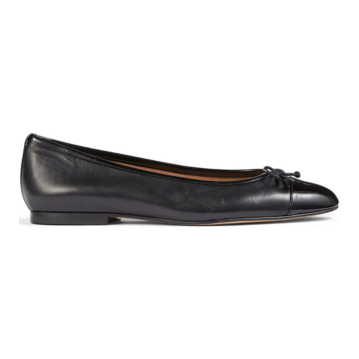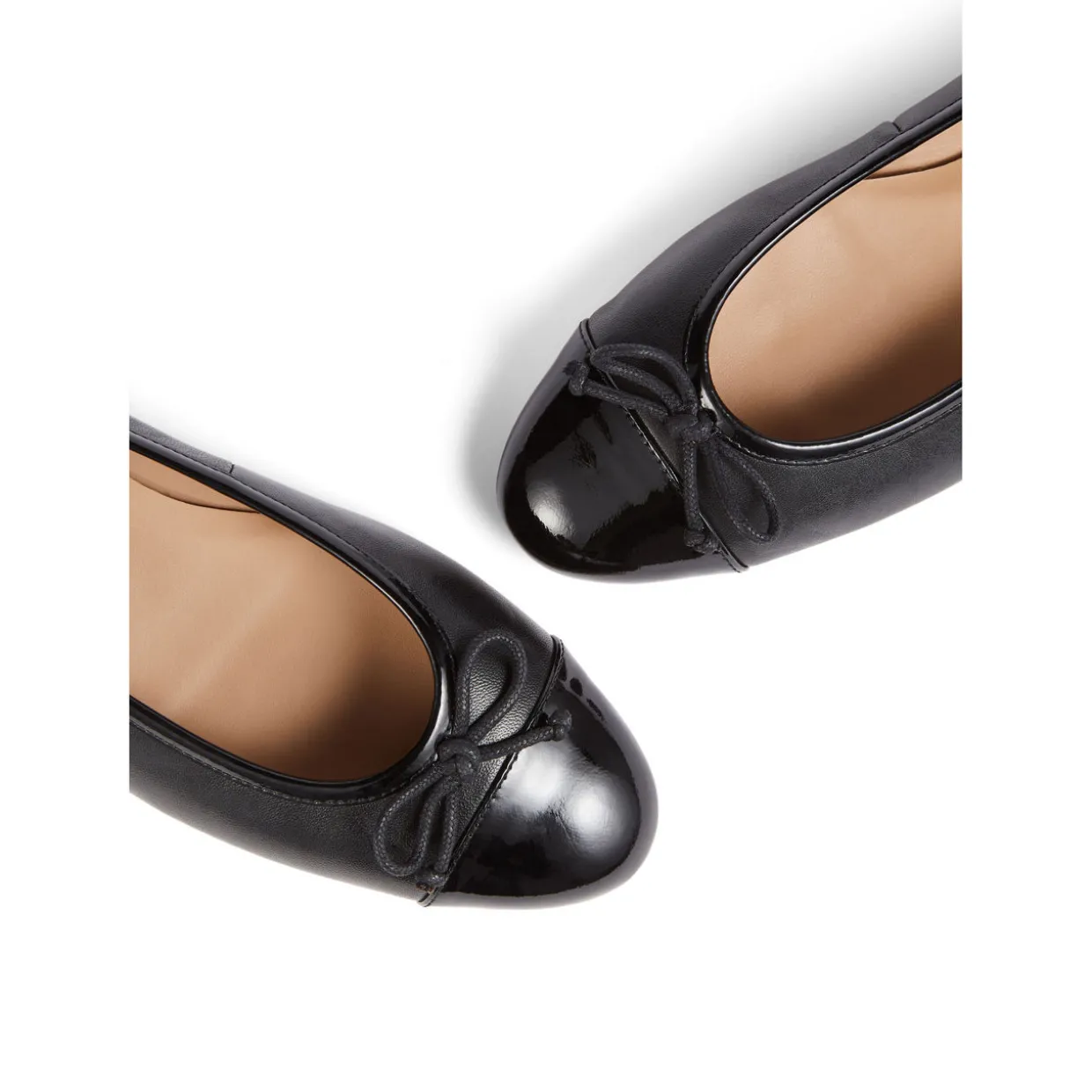 - Round toe, ballerina-style shape, bow detail, contrast toe cap