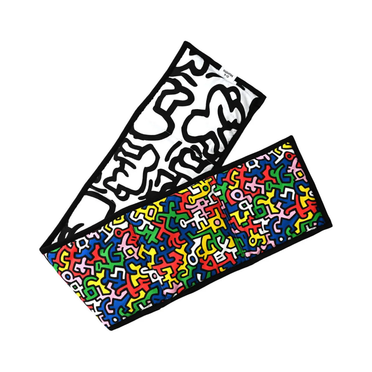 - One sensory strip, reversible, featuring Keith Haring designs, ‘Baby’ print side (newborn-4 month), ‘Brazil’ print side (5+ months), soft feel, comfy padded fill, tie tags for secure attachment