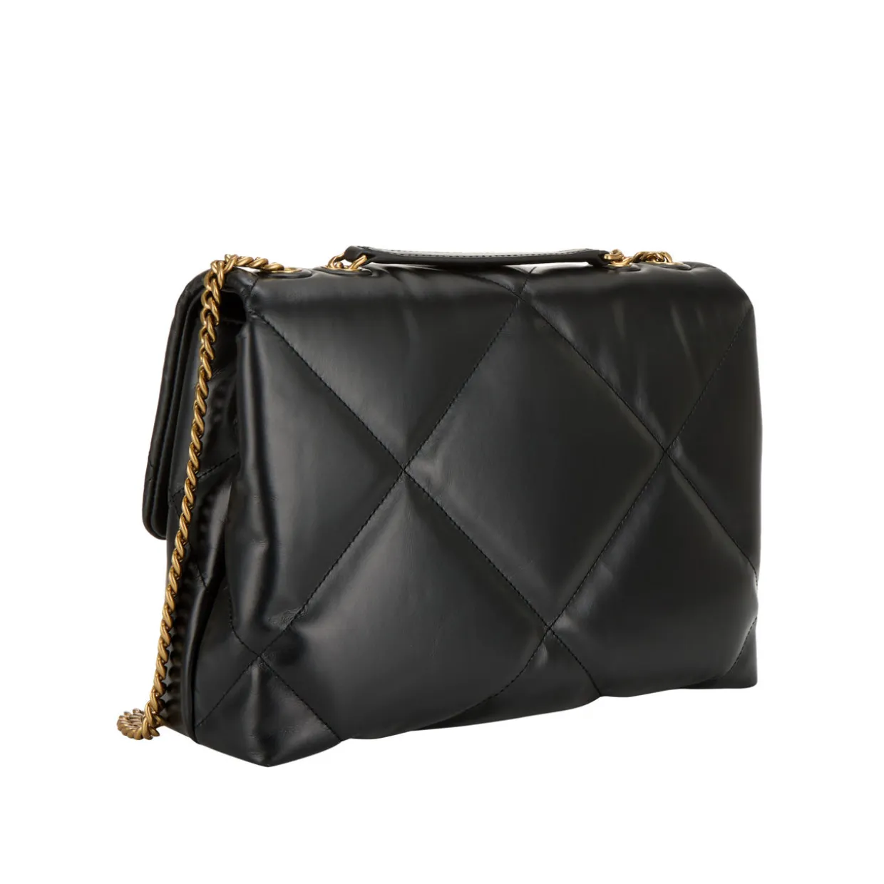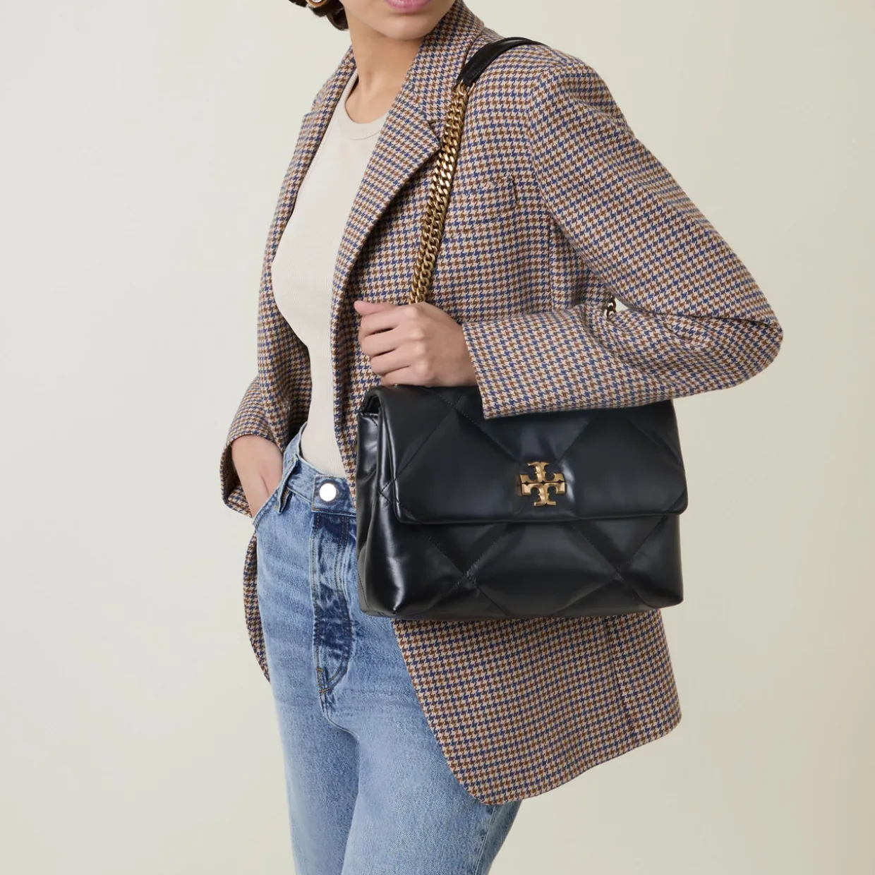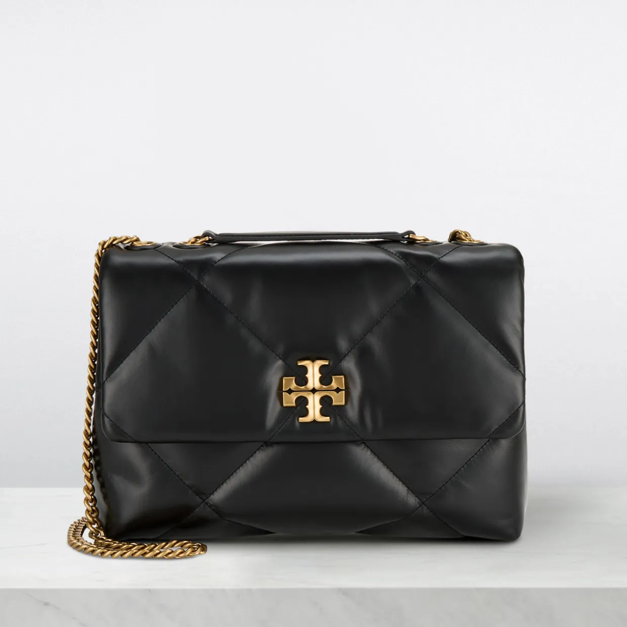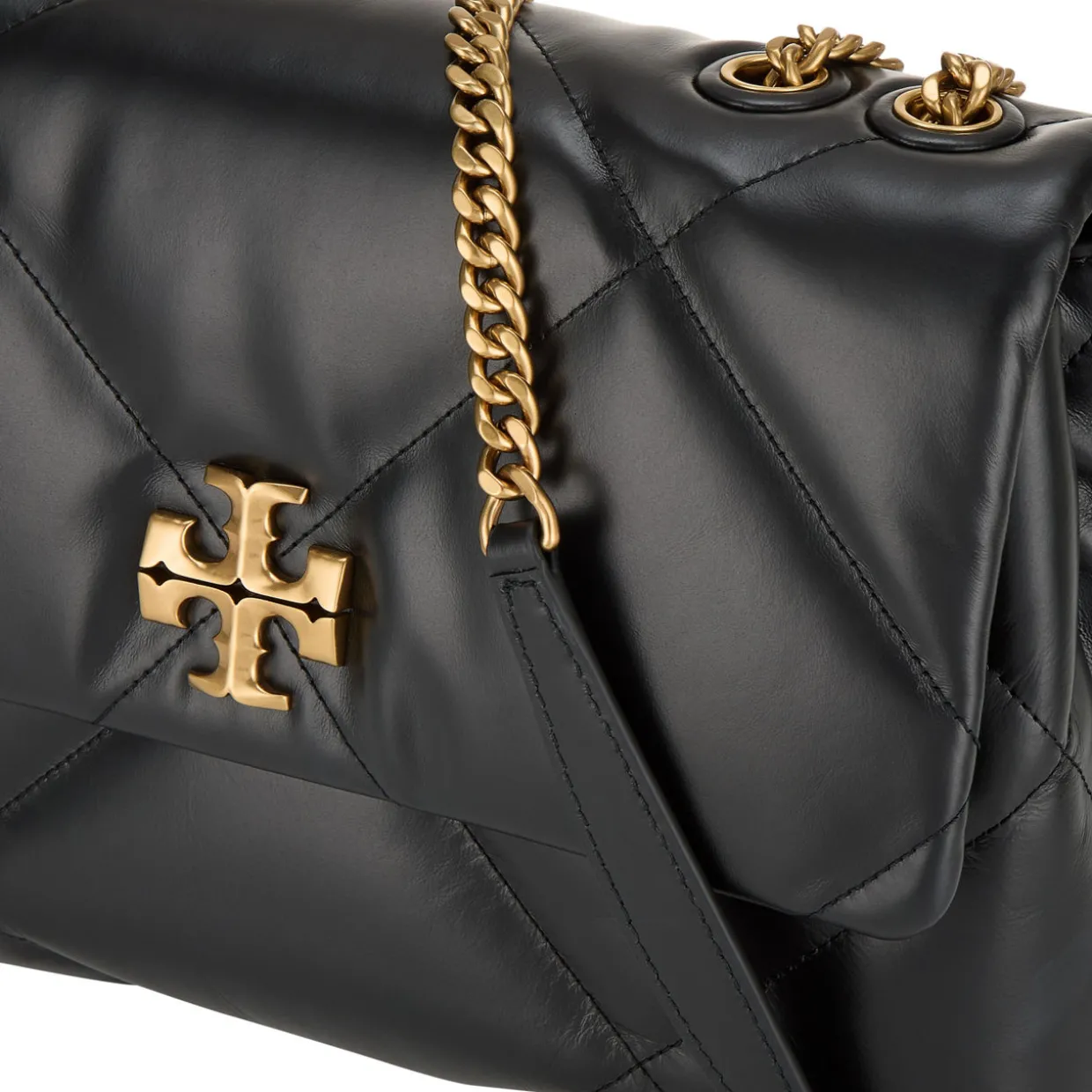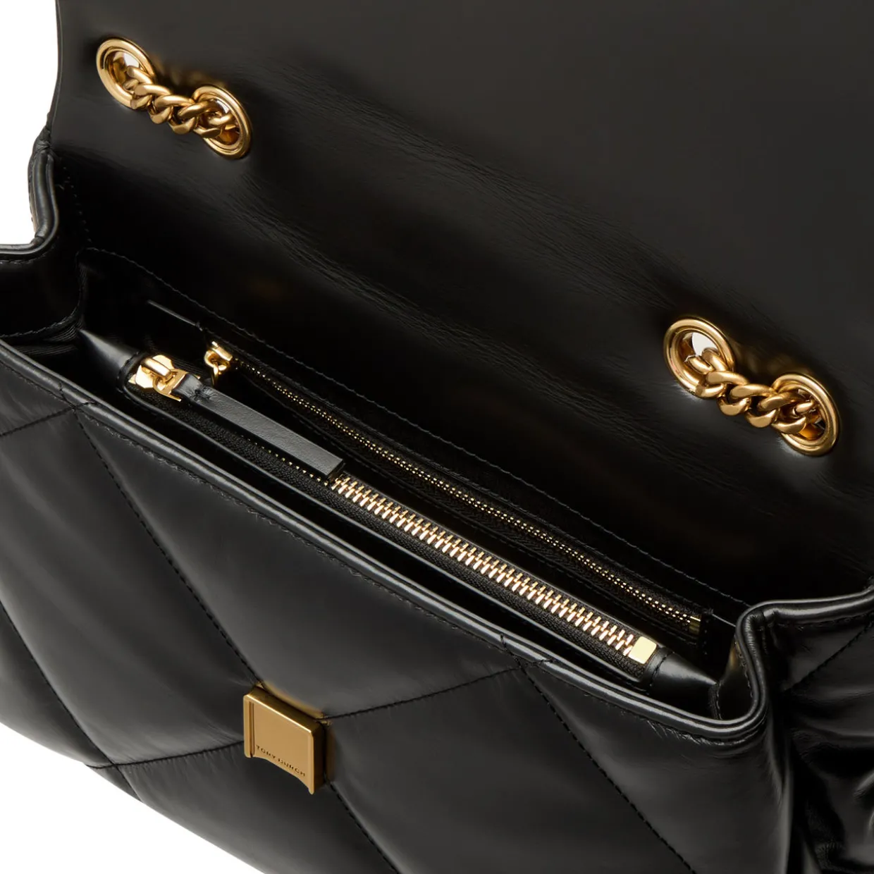 - Flap closure with magnetic fastening, double T hardware, chain shoulder strap, gold-tone hardware, chevron leather quilted finish