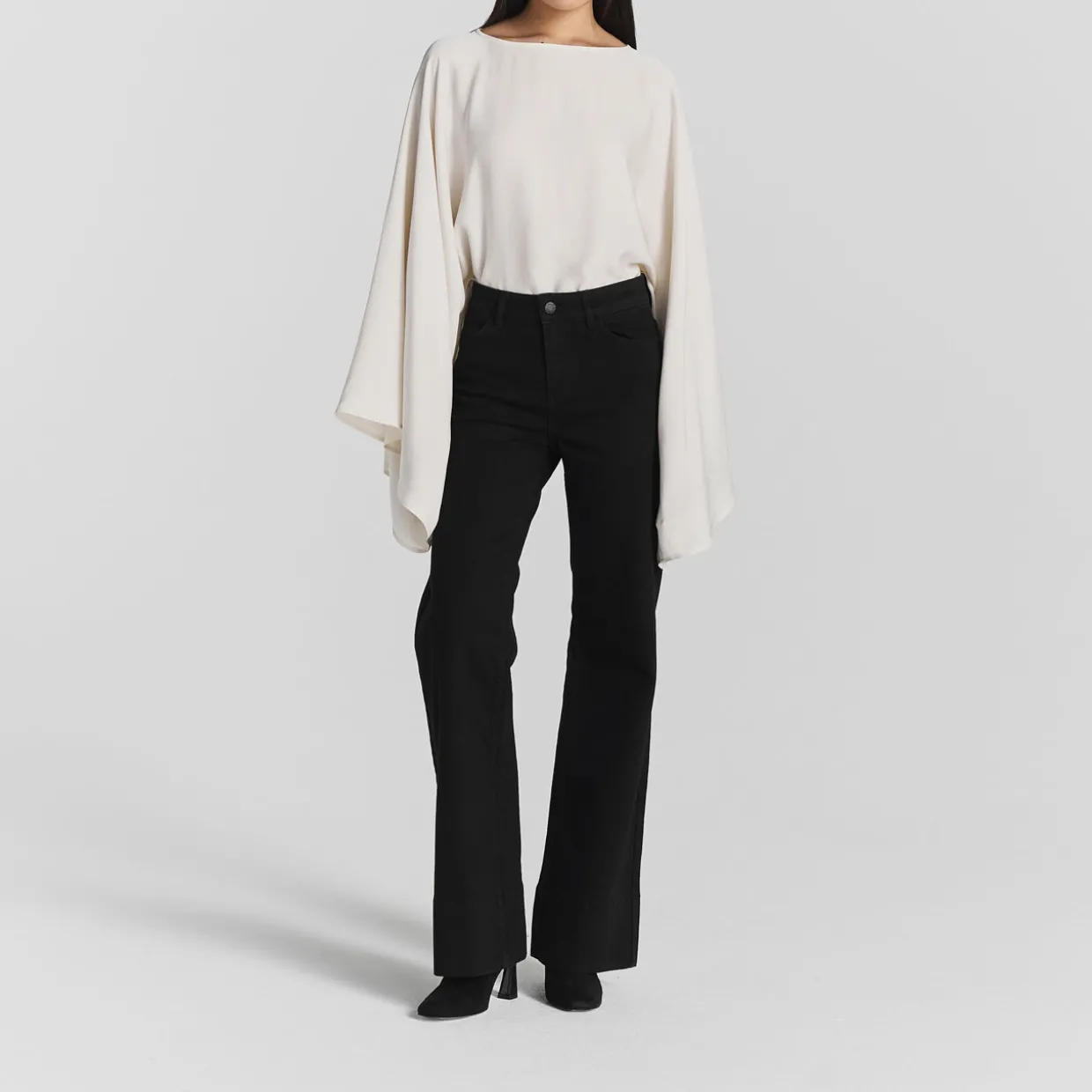 - Slash neckline, rear keyhole and button fastening, long waterfall sleeves, asymmetrical hem, smooth finish