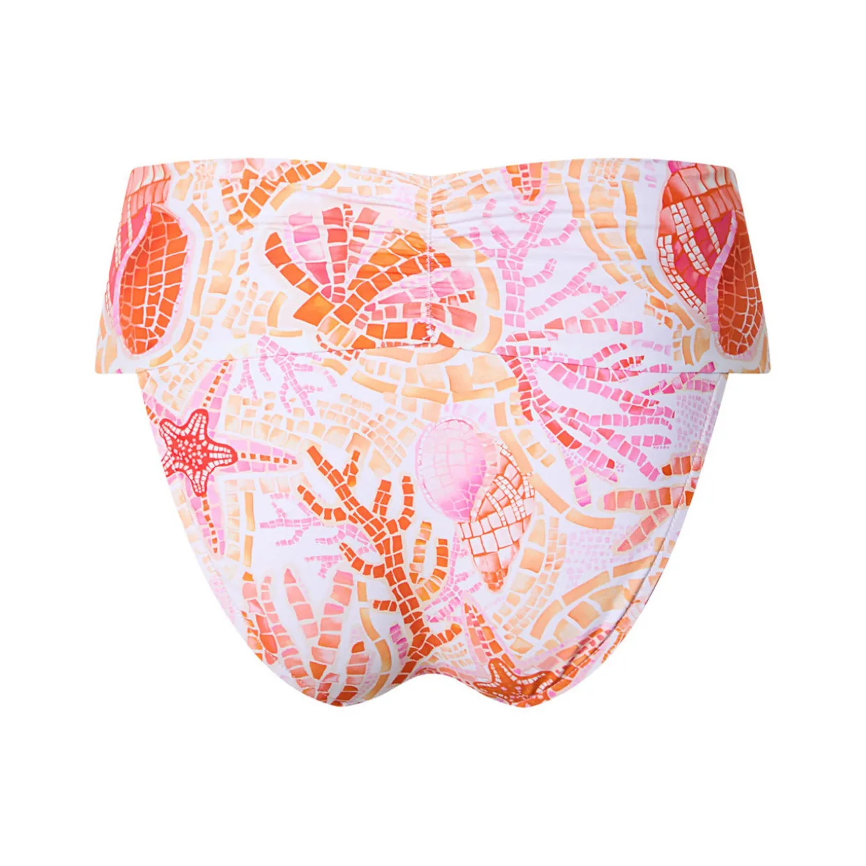 - Elasticated waistband, pull-up style, ocean print design, gathered detailing, mid rear coverage, smooth seamless finish