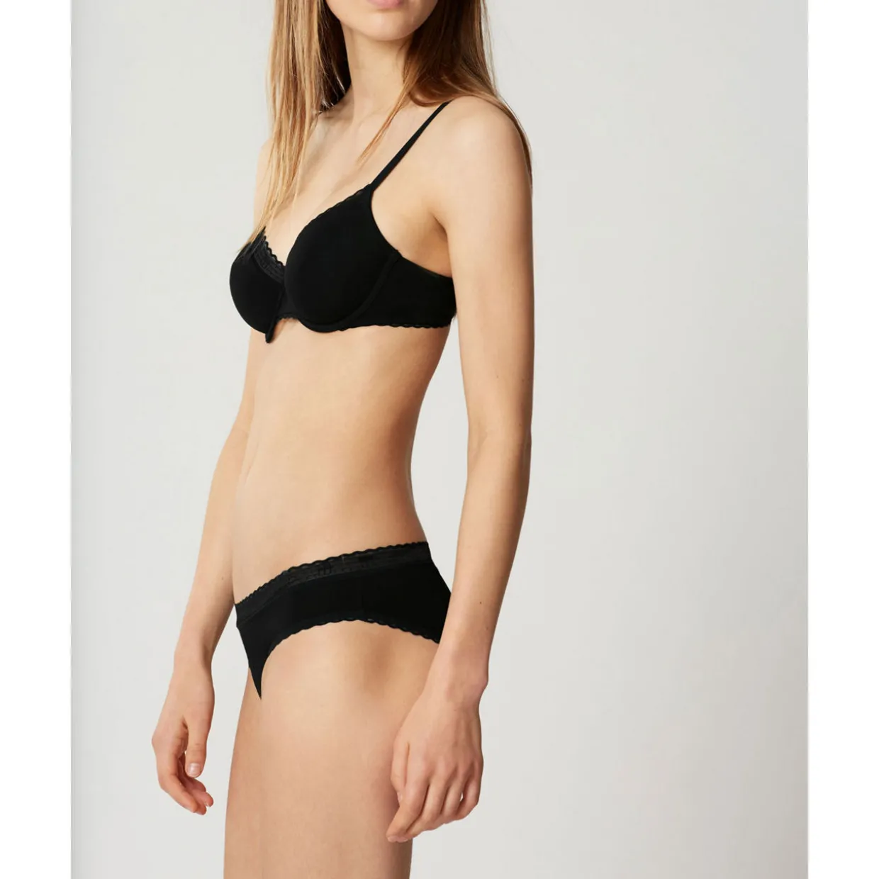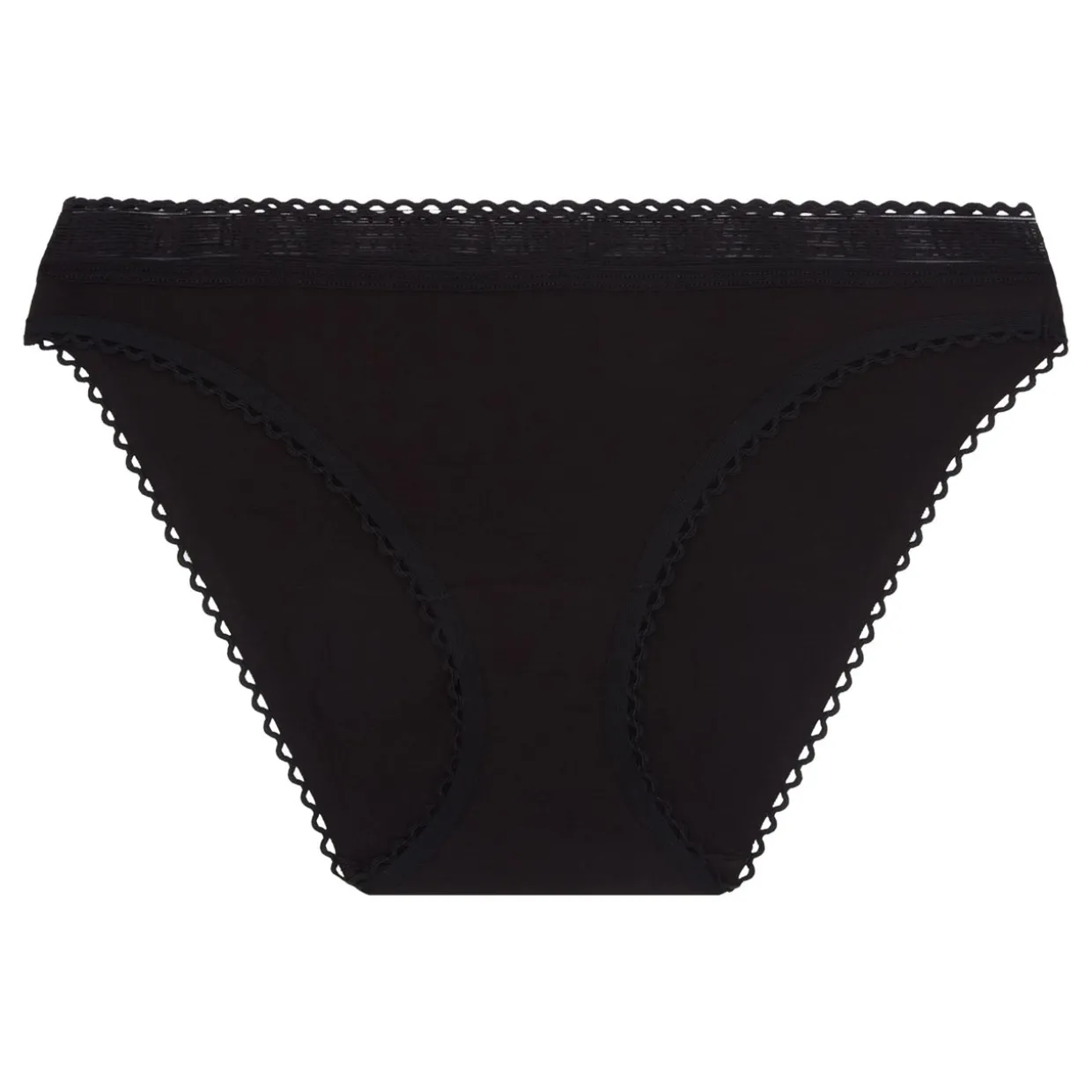 - Low rise, moderate coverage, scalloped trims, logo mesh waistband