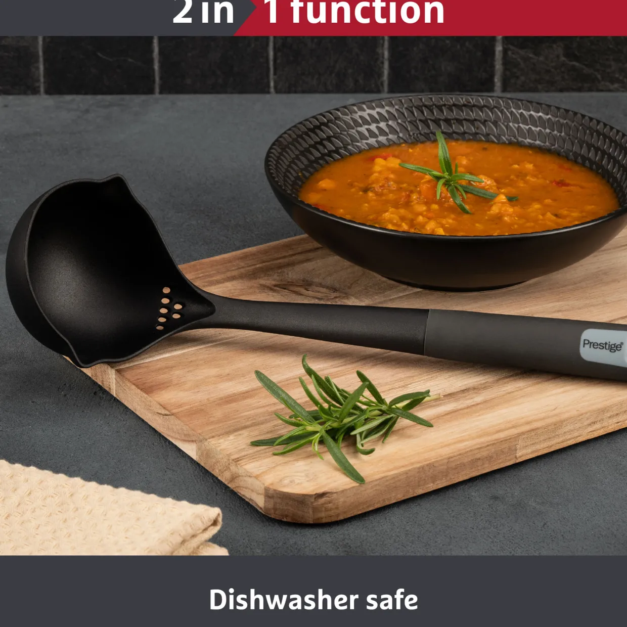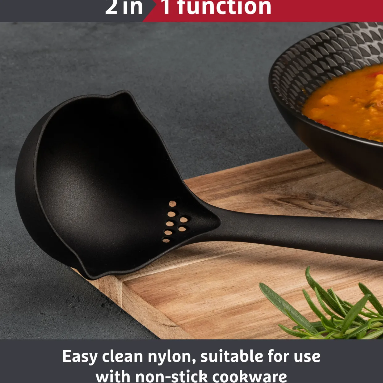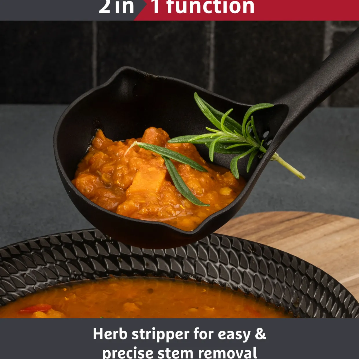 - Deep bowl ideal for soups, stews and sauces, built-in herb stripper for added prep efficiency, heat resistant up to 210°c for safe serving, soft-touch handle for a secure, comfortable grip, dishwasher safe for hassle-free maintenance, sleek design fits neatly in utensil holders