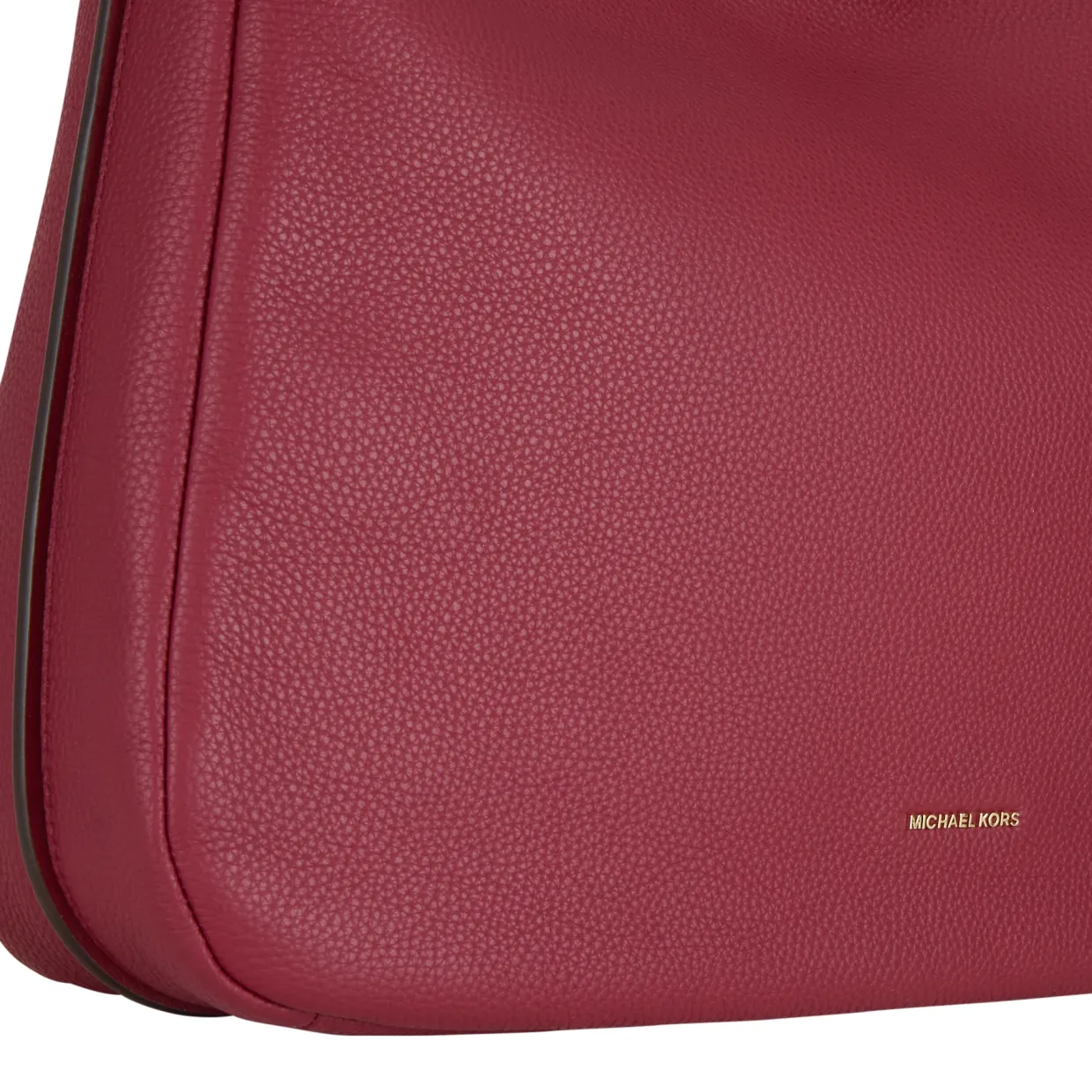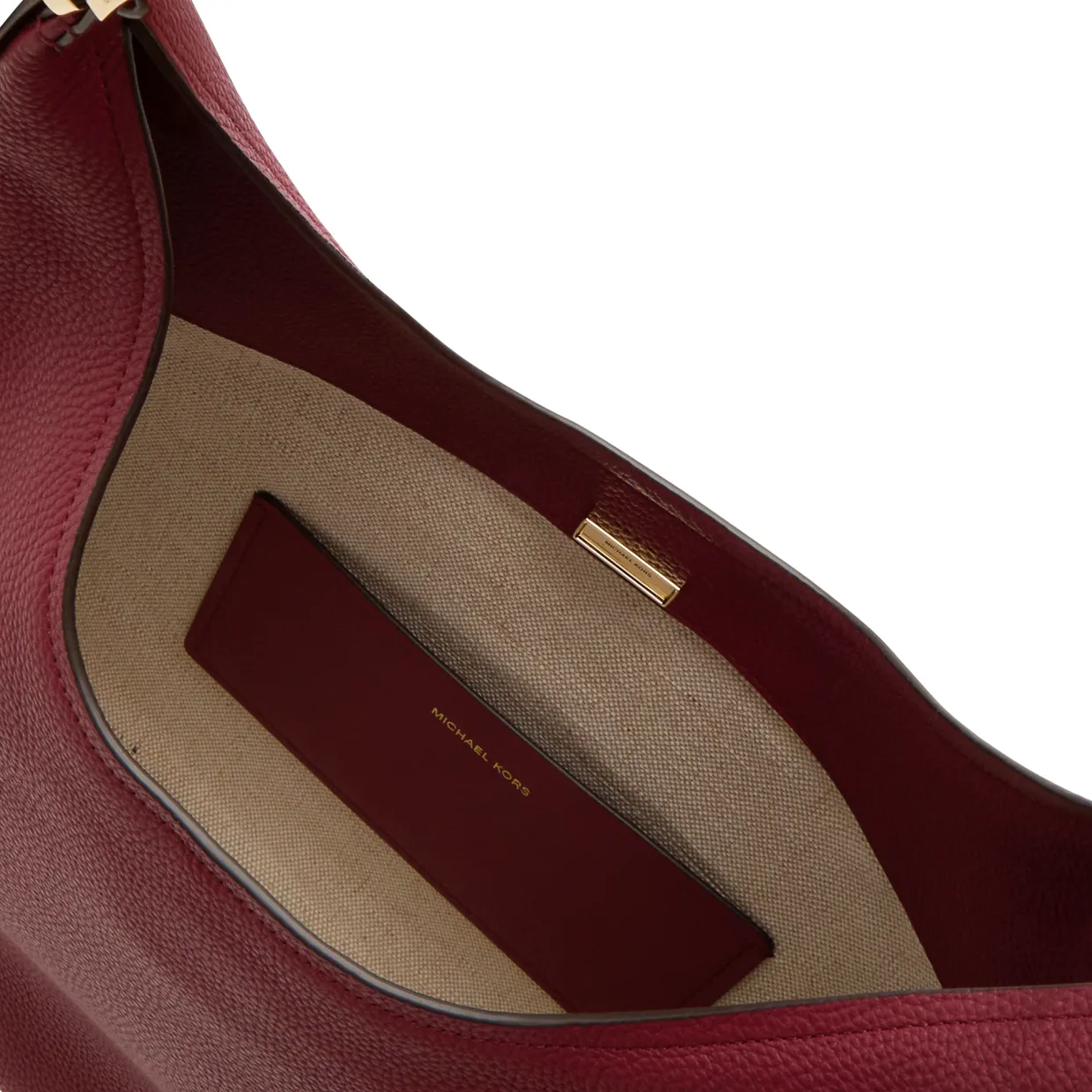 - Adjustable buckle shoulder strap, secure clasp closure, slouchy hobo style, front logo lettering, gold-tone hardware, grained leather finish
