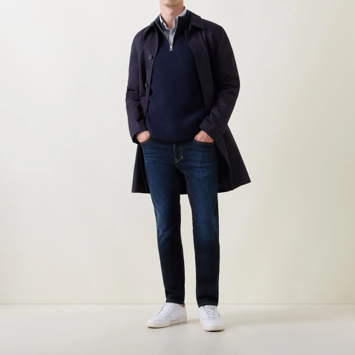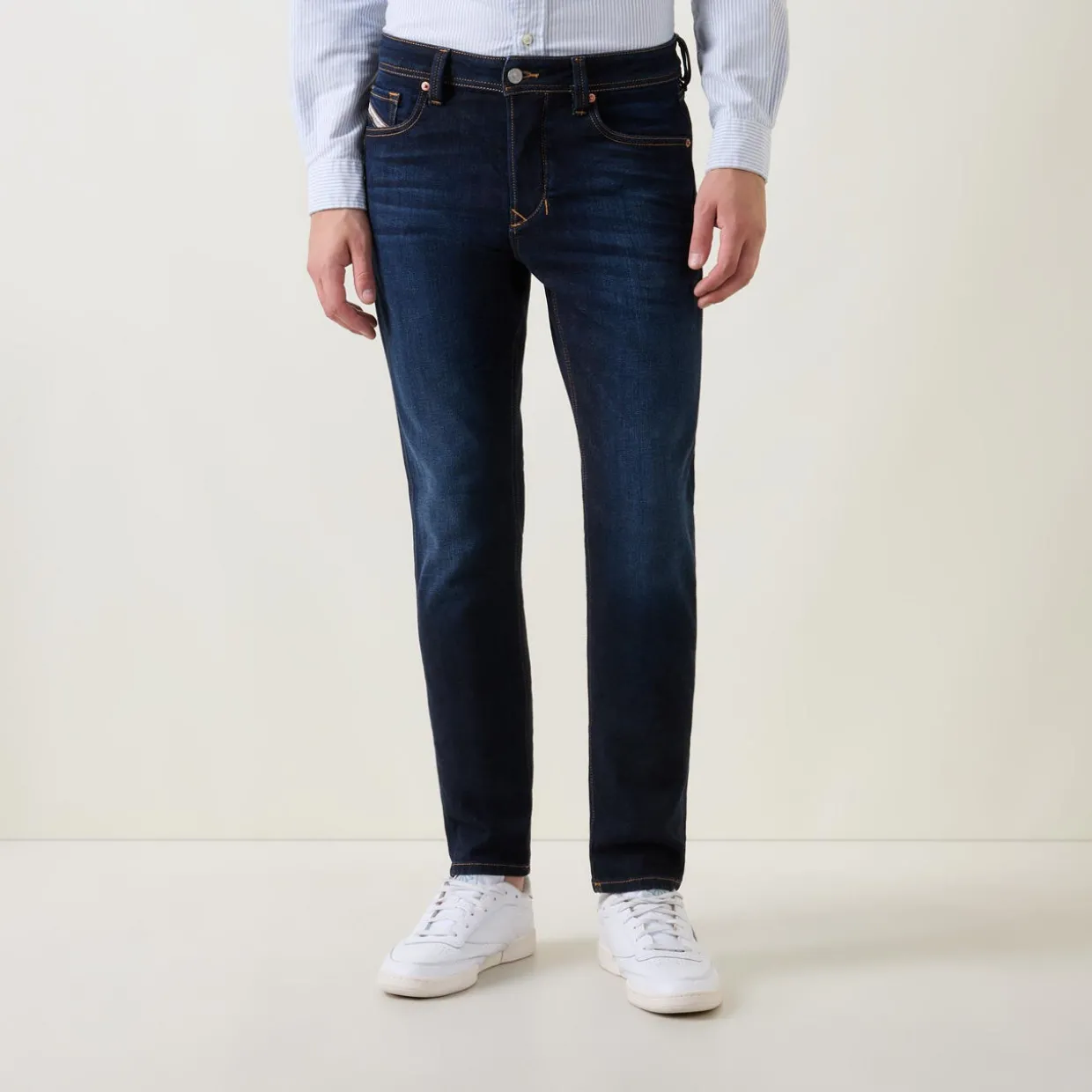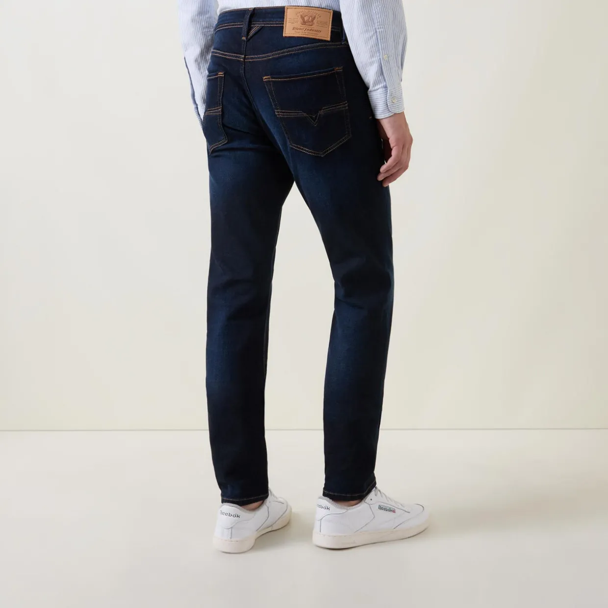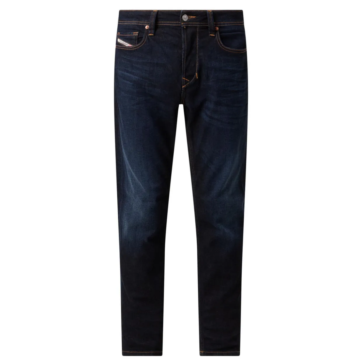 - Button and fly zipper fastening, belt loops, five pocket design, whiskering and faded details, tobacco stitching, branding details