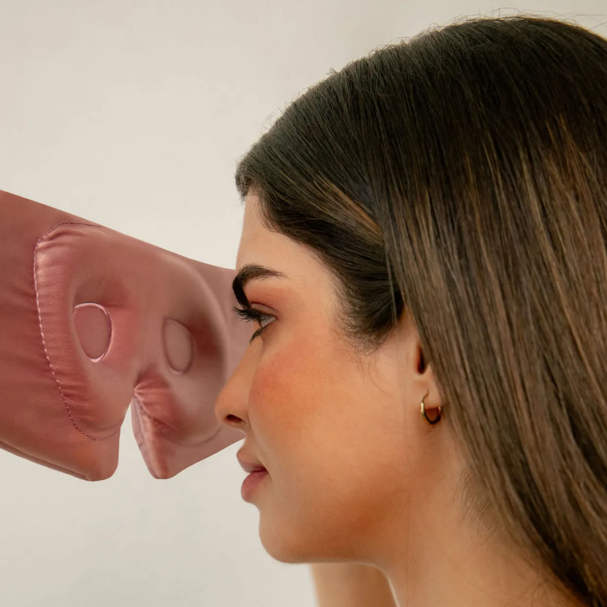 - Eyelash-protecting sleep mask, embroidered logo, deep contoured eyecups, padding, black-out design, fully adjustable velcro strap