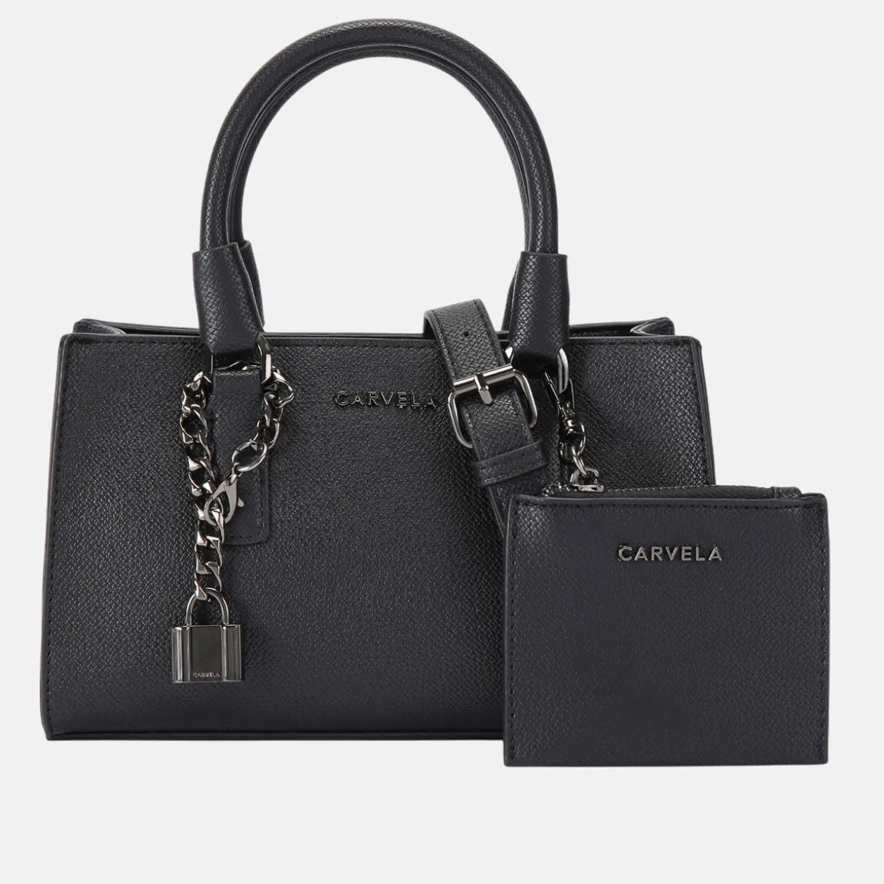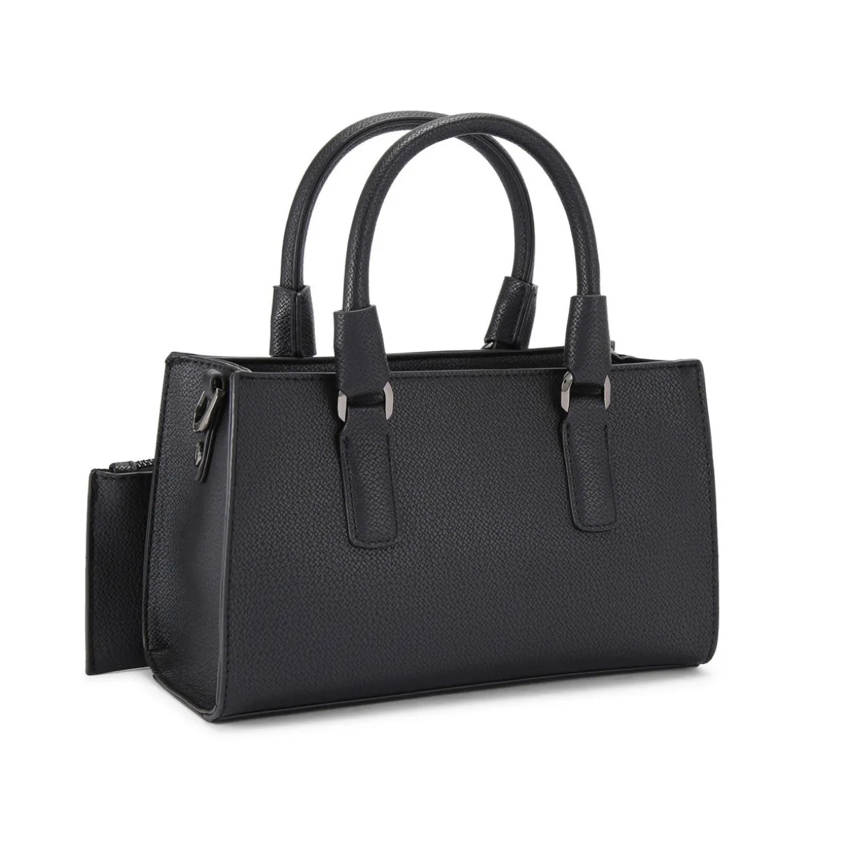 - Double top handles, removable strap, removable zipped purse, gunmetal-tone hardware, branding