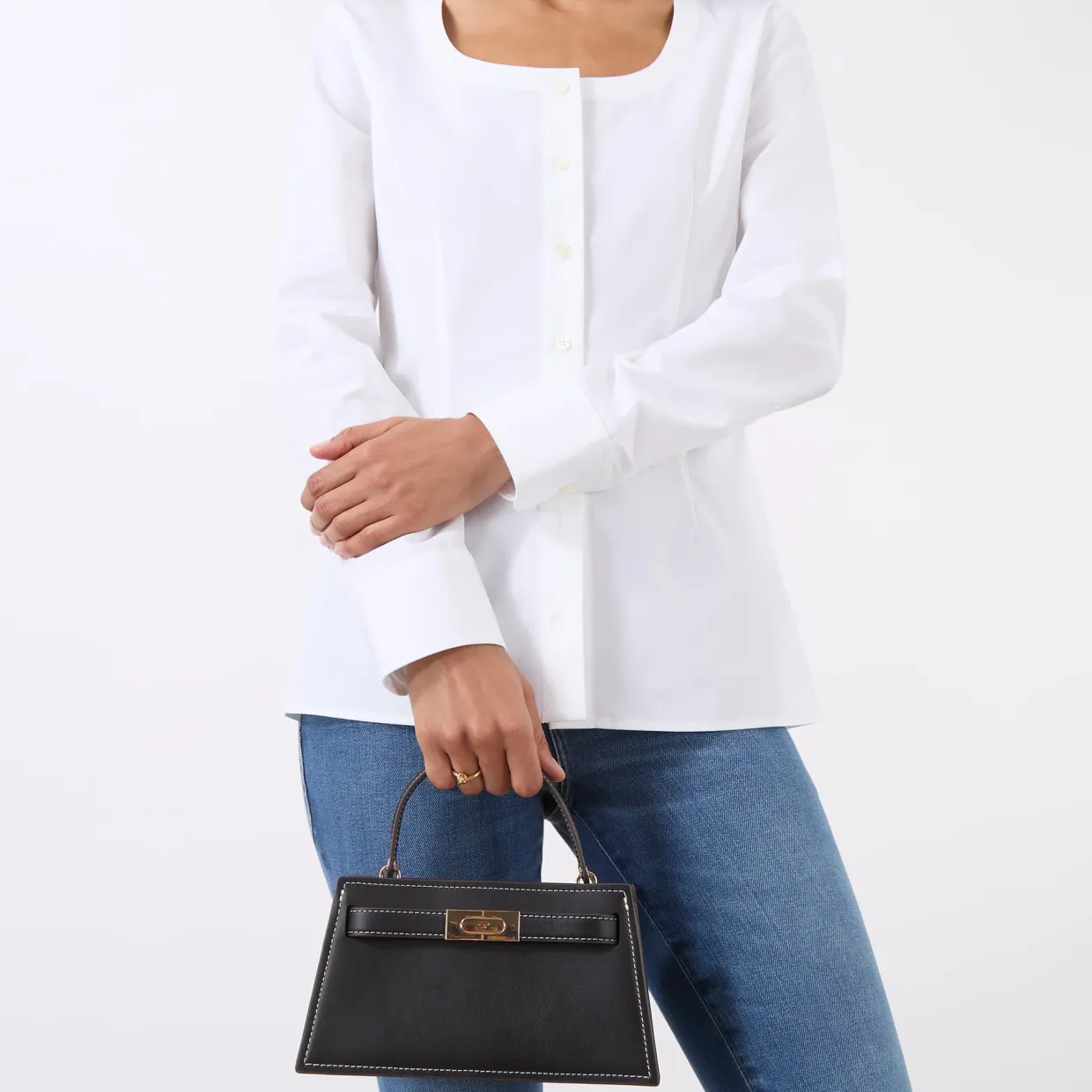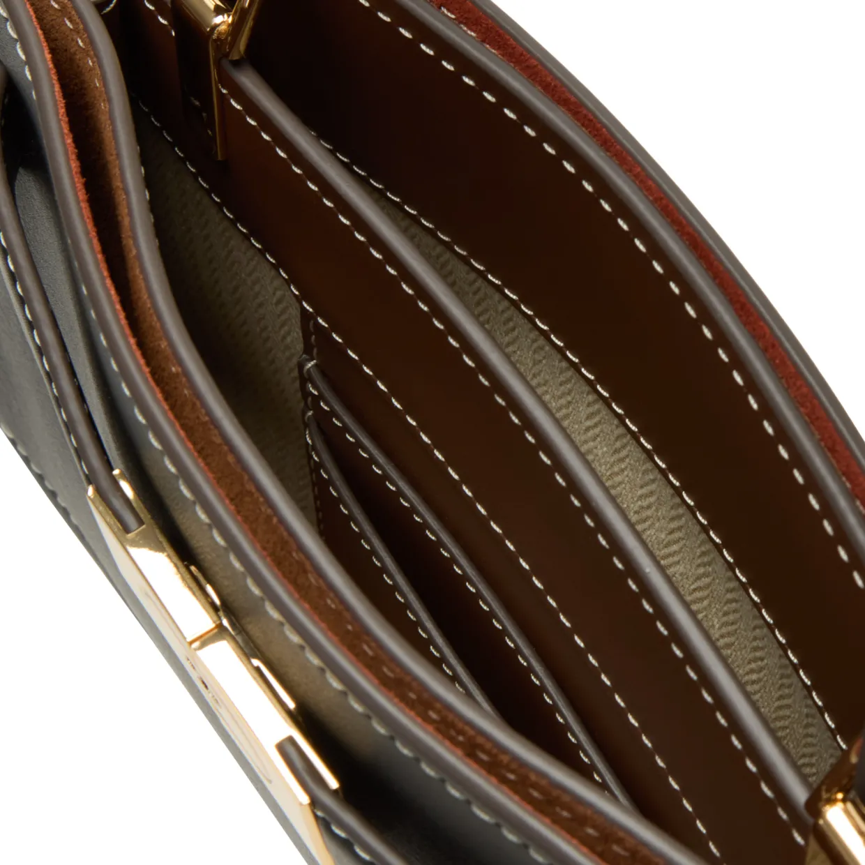 - Top handle, belt detail fastening, detachable and adjustable crossbody strap, gold-tone hardware, smooth leather finish, contrast stitching, structured silhouette