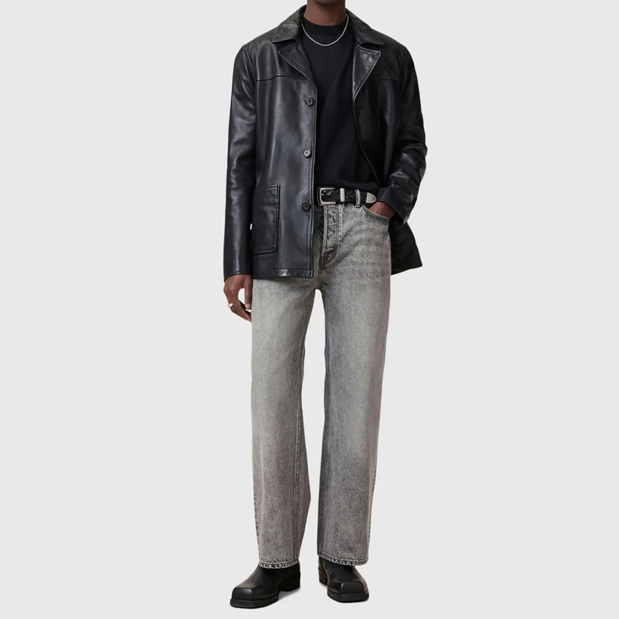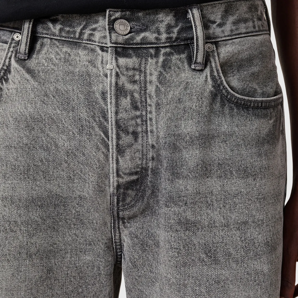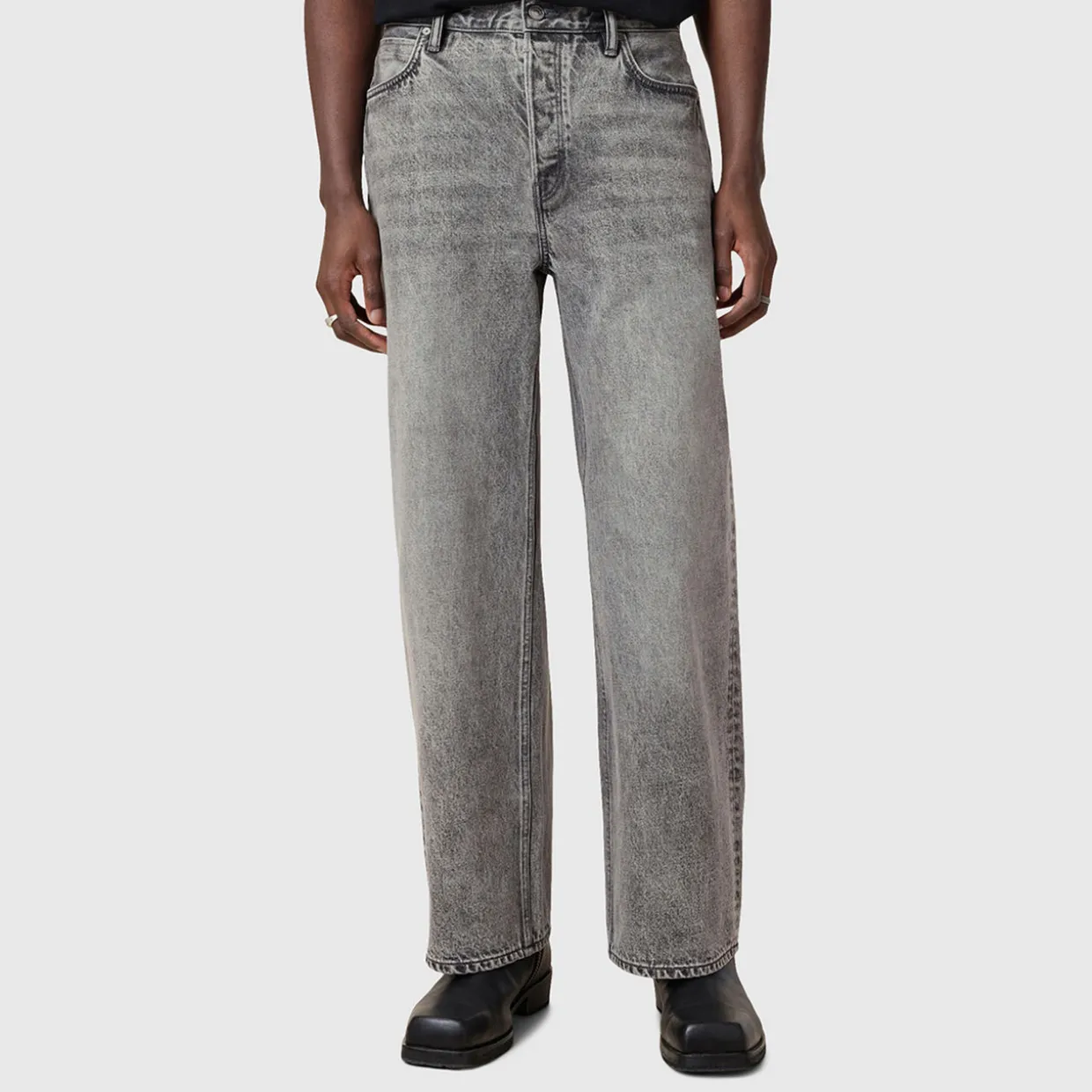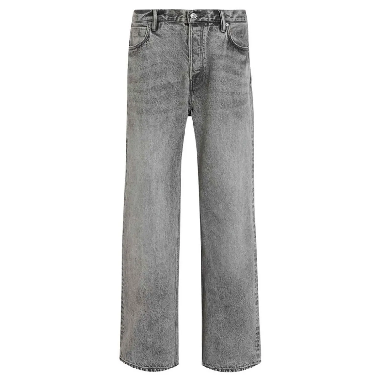 - Button closure, high-rise, five-pocket construction, straight wide leg, reinforced belt loops, reinforced back pockets, ramskull leather tab on back pocket, Allsaint signature print on interior pocket