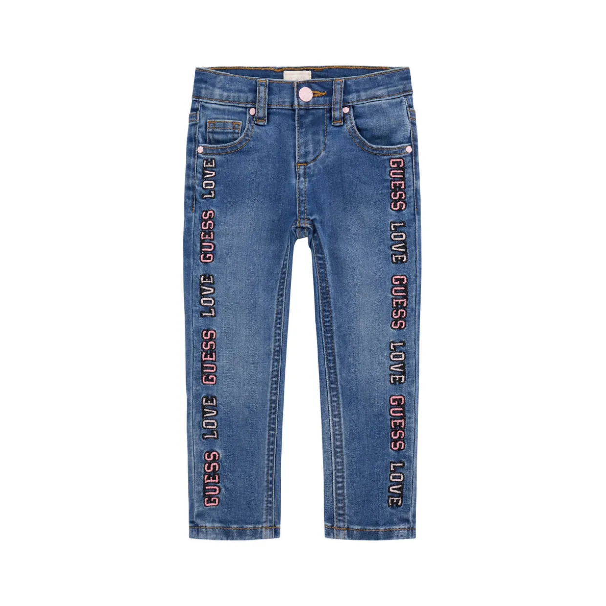 - Skinny silhouette, letter love logo detailing, contrast stitching, belt loops, button and fly fastening, five-pocket style, triangle logo detail