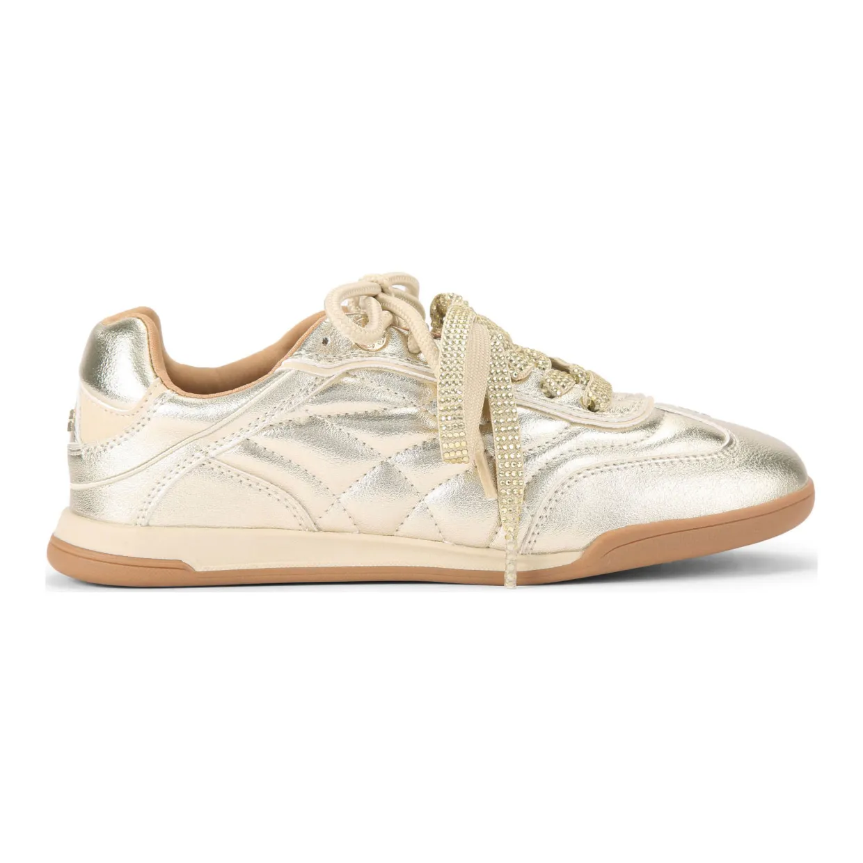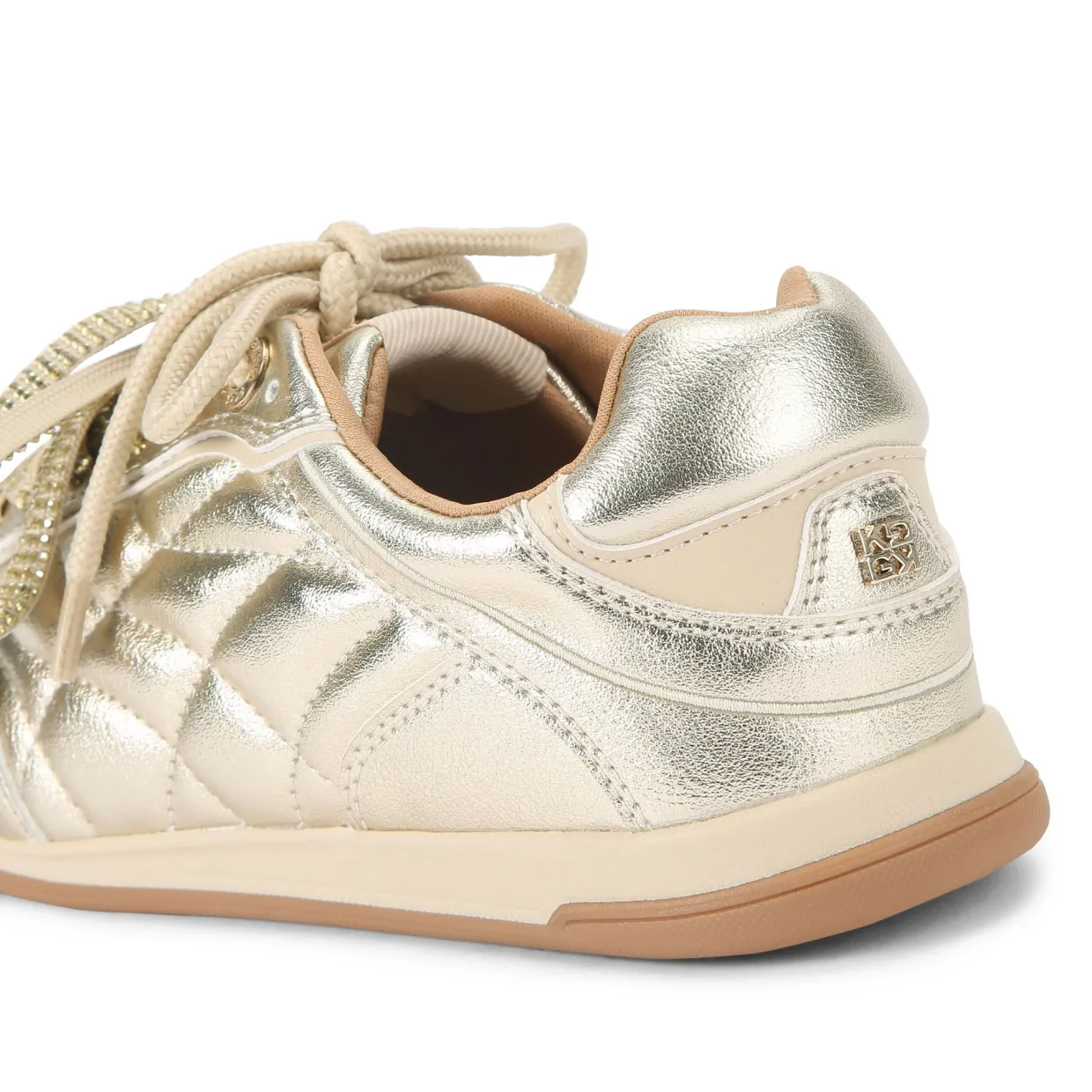 - Metallic faux-leather fabric, double laces, one classic style, one crystal-embellished style