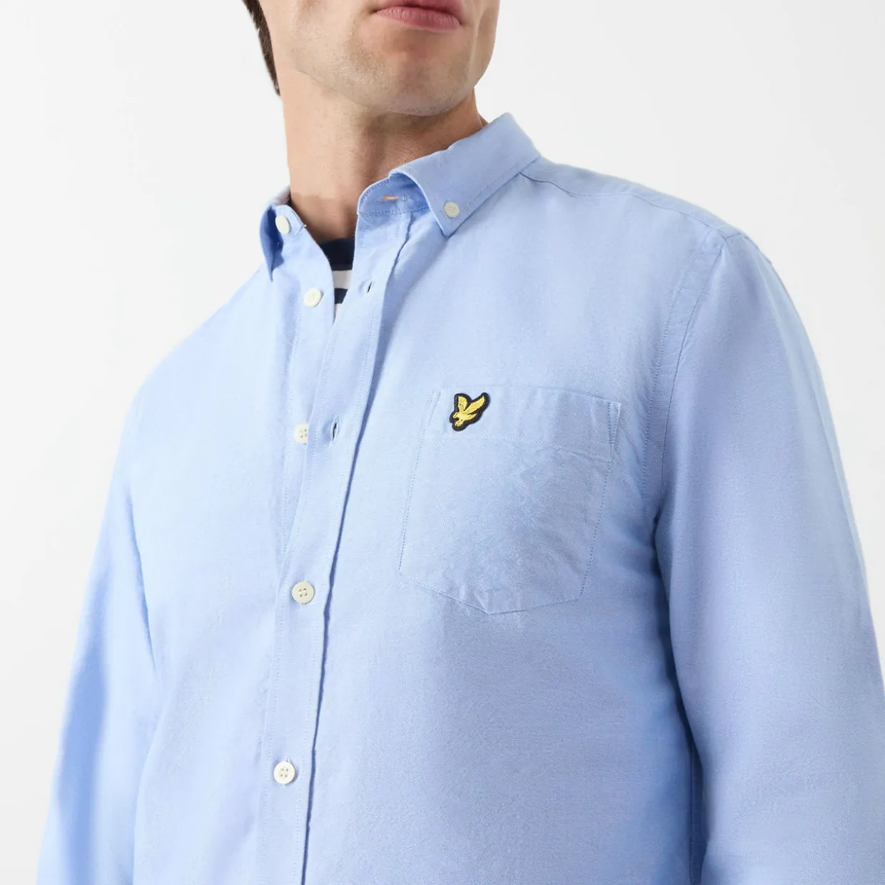 - Button-down point collar, long sleeves, buttoned cuffs, front button fastening, curved hem, rear box pleat, locker loop, logo detail on the chest