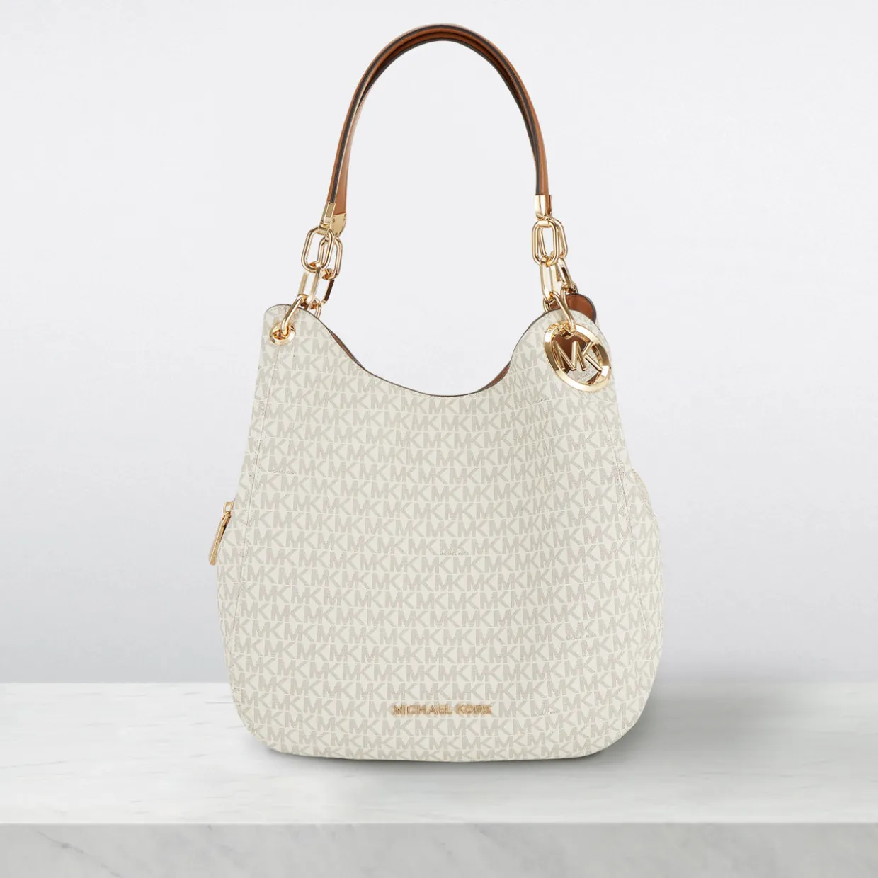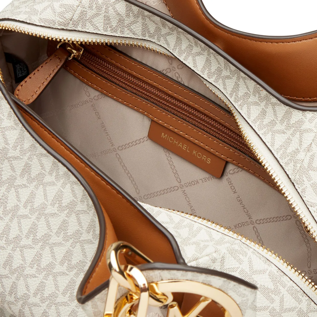 - Two top handles, chain detail, gold-tone hardware, logo lettering, top zip-fastening, slouchy silhouette, back zip-fastening pocket, grained leather finish