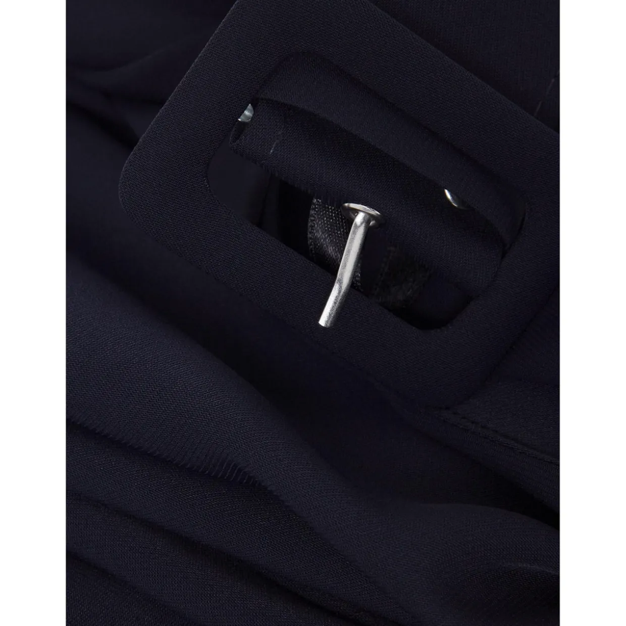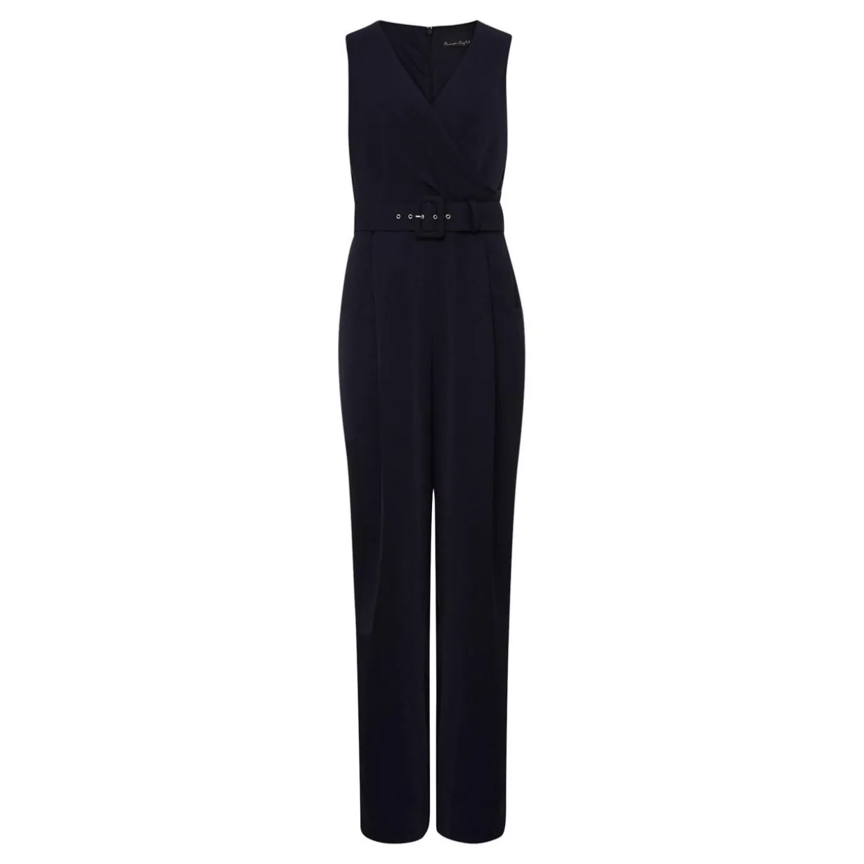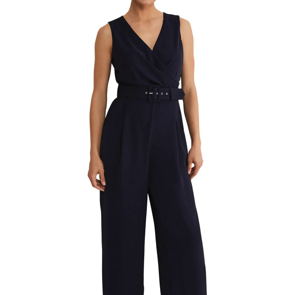- Faux wrap detail, V-neckline, wide covered belt, sleeveless, pleated wide-leg, pockets, concealed zip fastening
