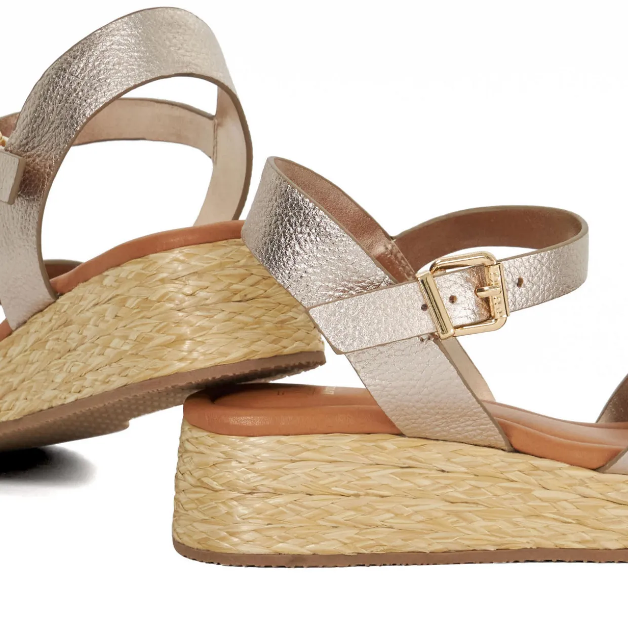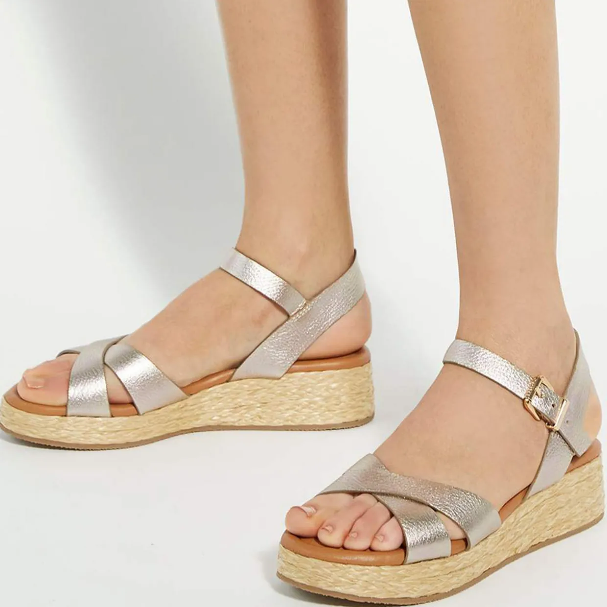 - Wedge heel, sandal toe, cross over front straps, adjustable ankle strap, lightweight raffia flatform sole