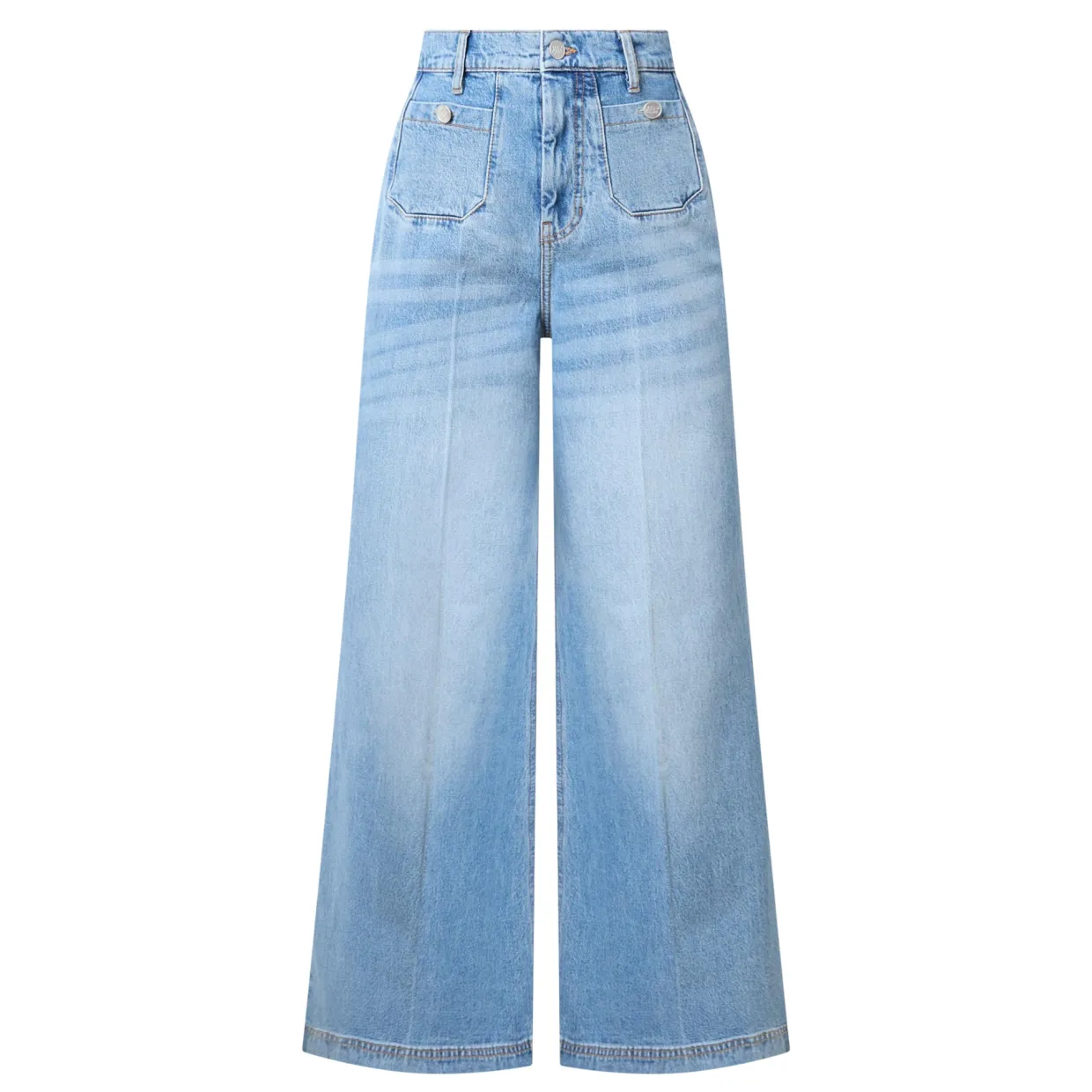 - Zip-fly and button fastening, belt loops, two front patch pockets, two rear patch pockets, contrast top stitching, rear logo patch, whiskering and faded detailing, pressed creases, high-rise, wide-cut leg, smooth denim finish