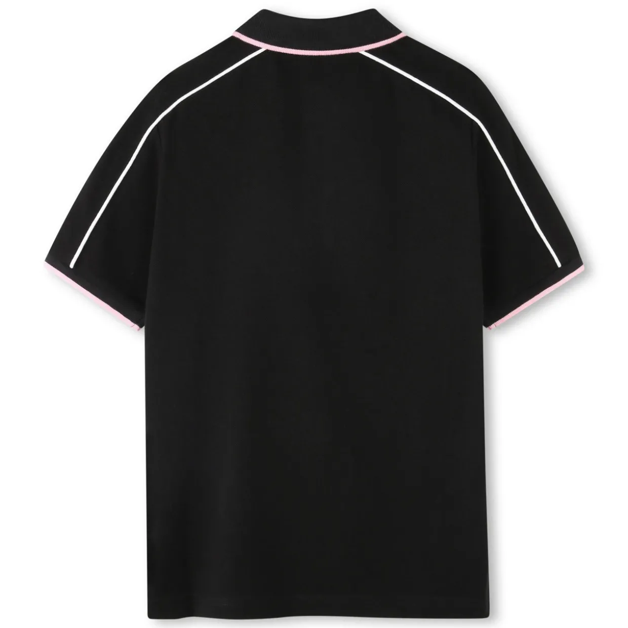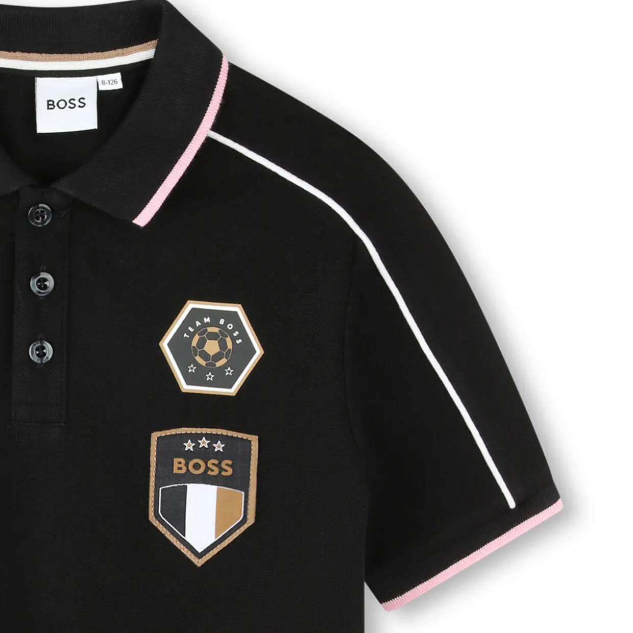 - Polo collar, contrast stripe detailing, three button placket, shoulder piping, short sleeves, chest badges, side slits, regular fit