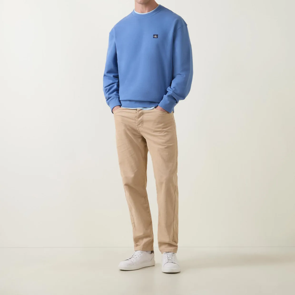 - Crew neckline, long sleeves, dropped shoulders, logo badge on chest, pullover style, elasticated hemline, stretch cuffs, smooth fabric