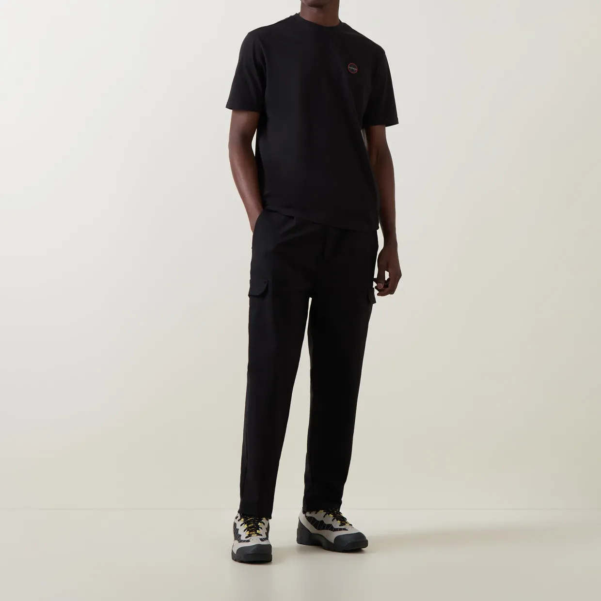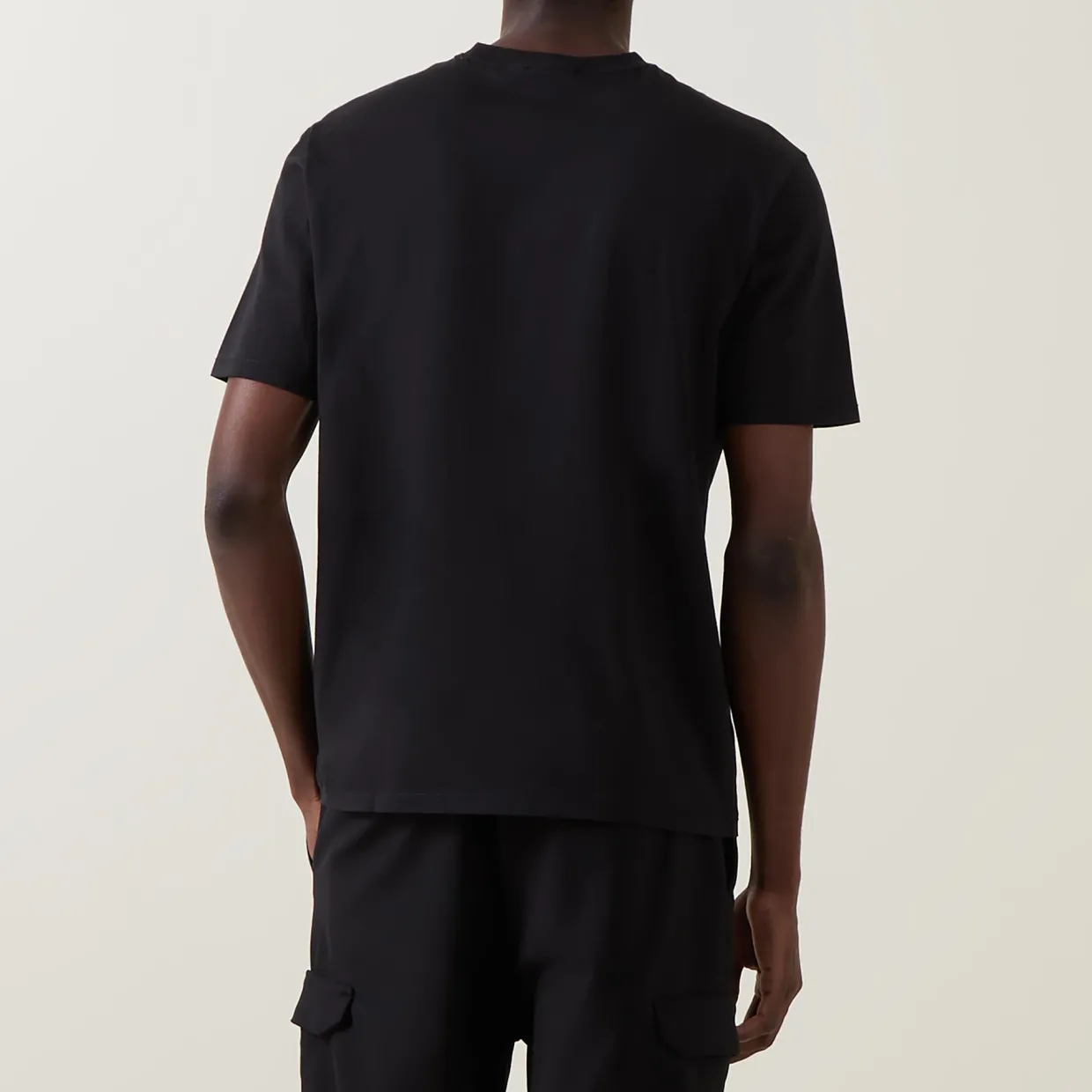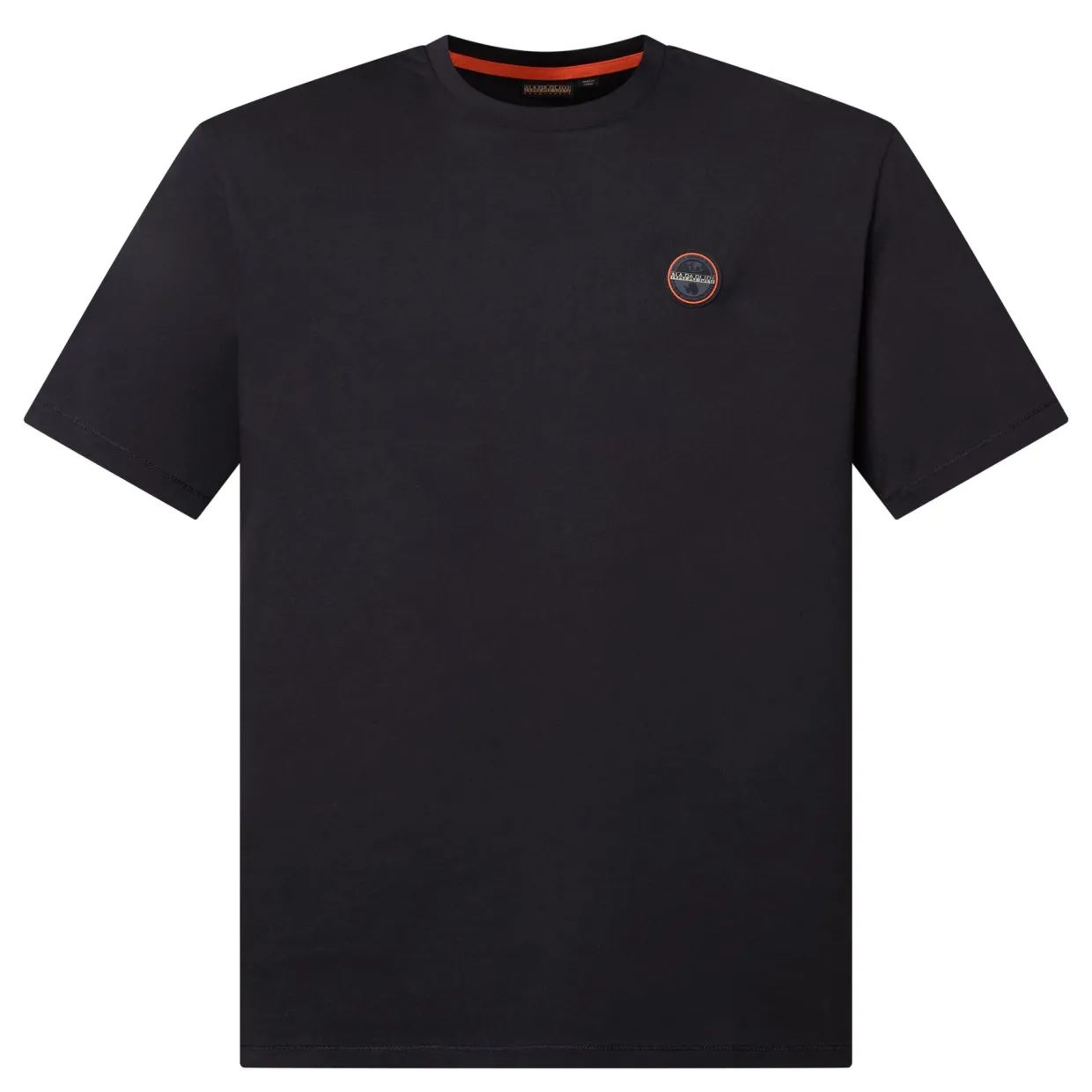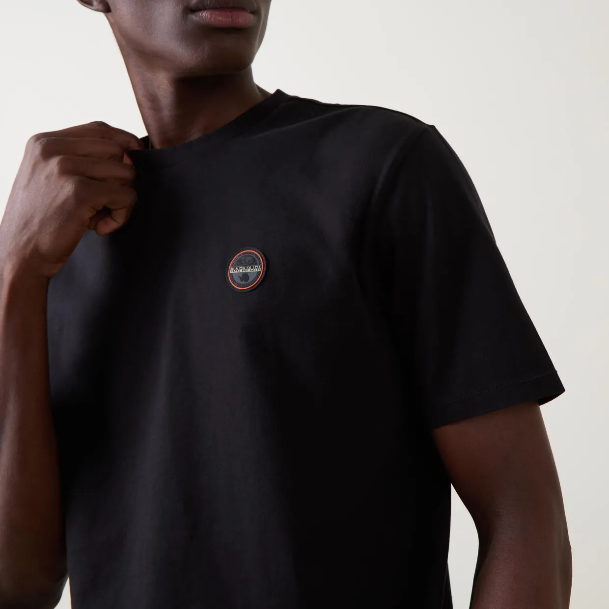 - Short sleeves, round neckline, logo badge detail on chest, tonal stitching, straight hemline, smooth fabric
