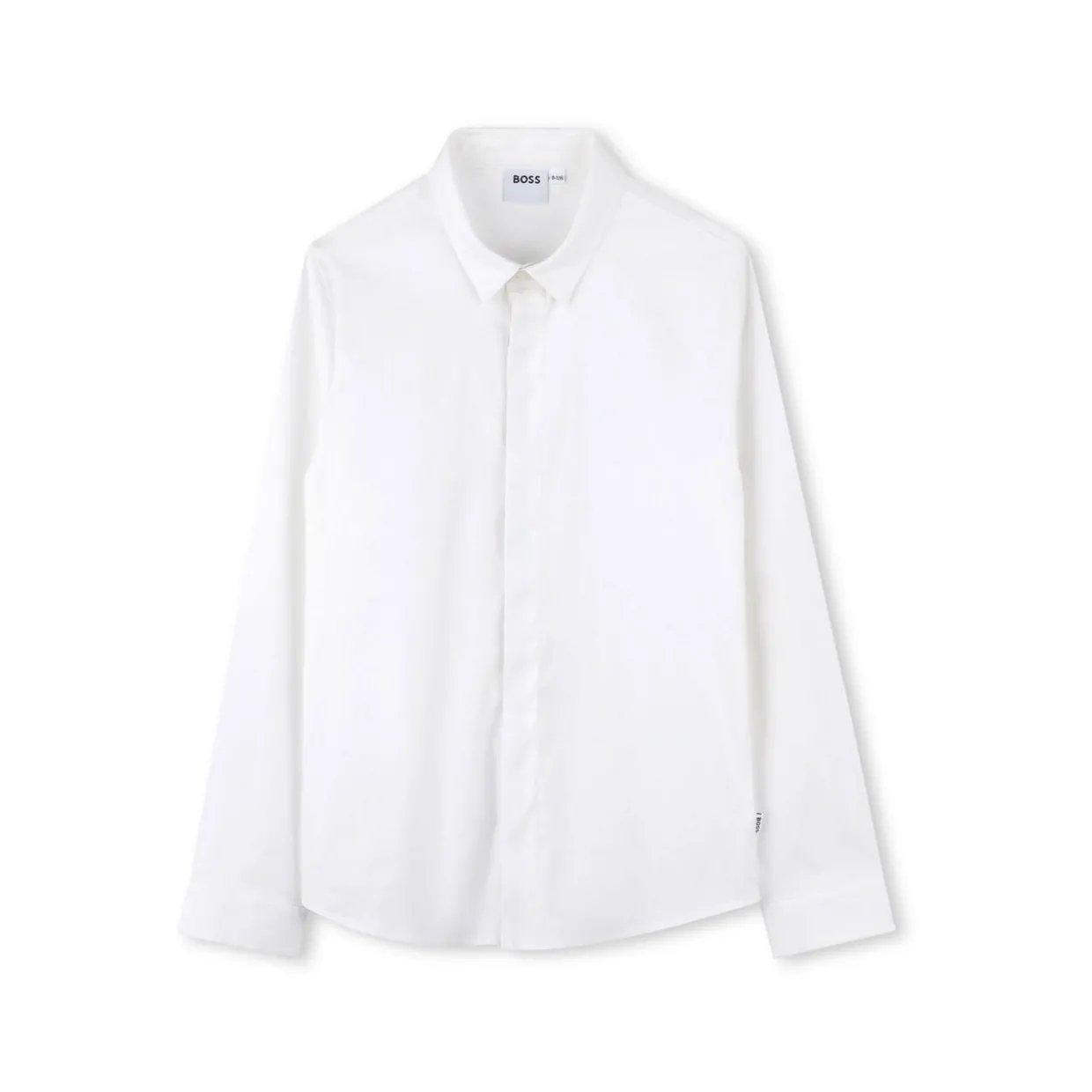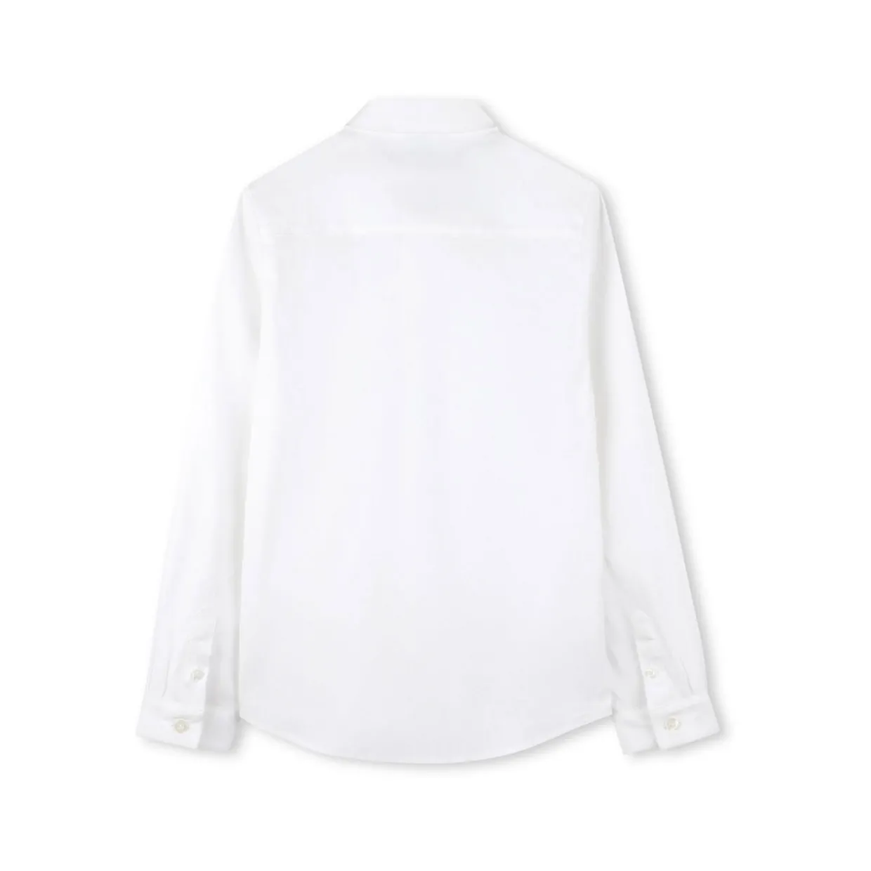 - Classic collar, long sleeves, curved hemline, button fastening, embroidered logo detail