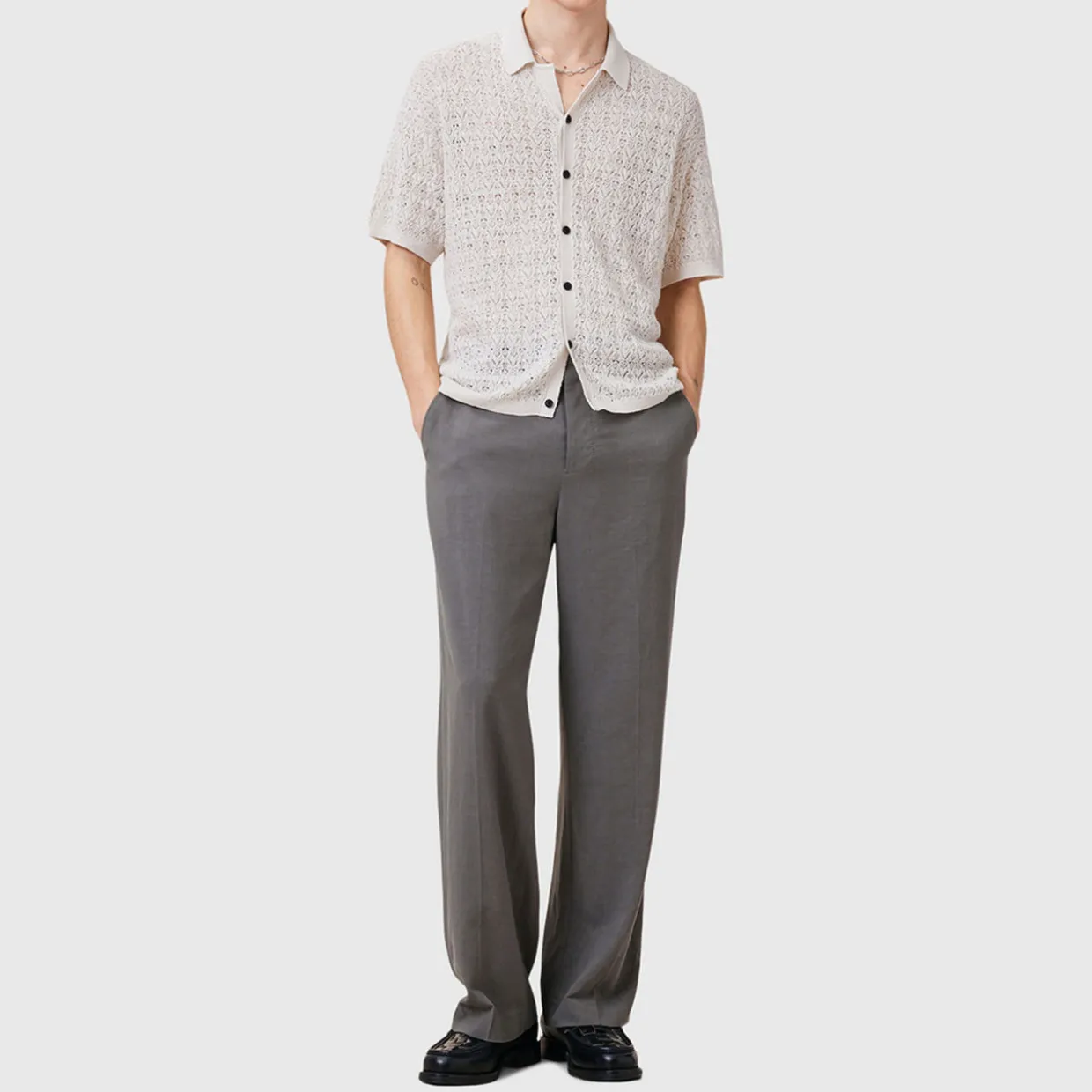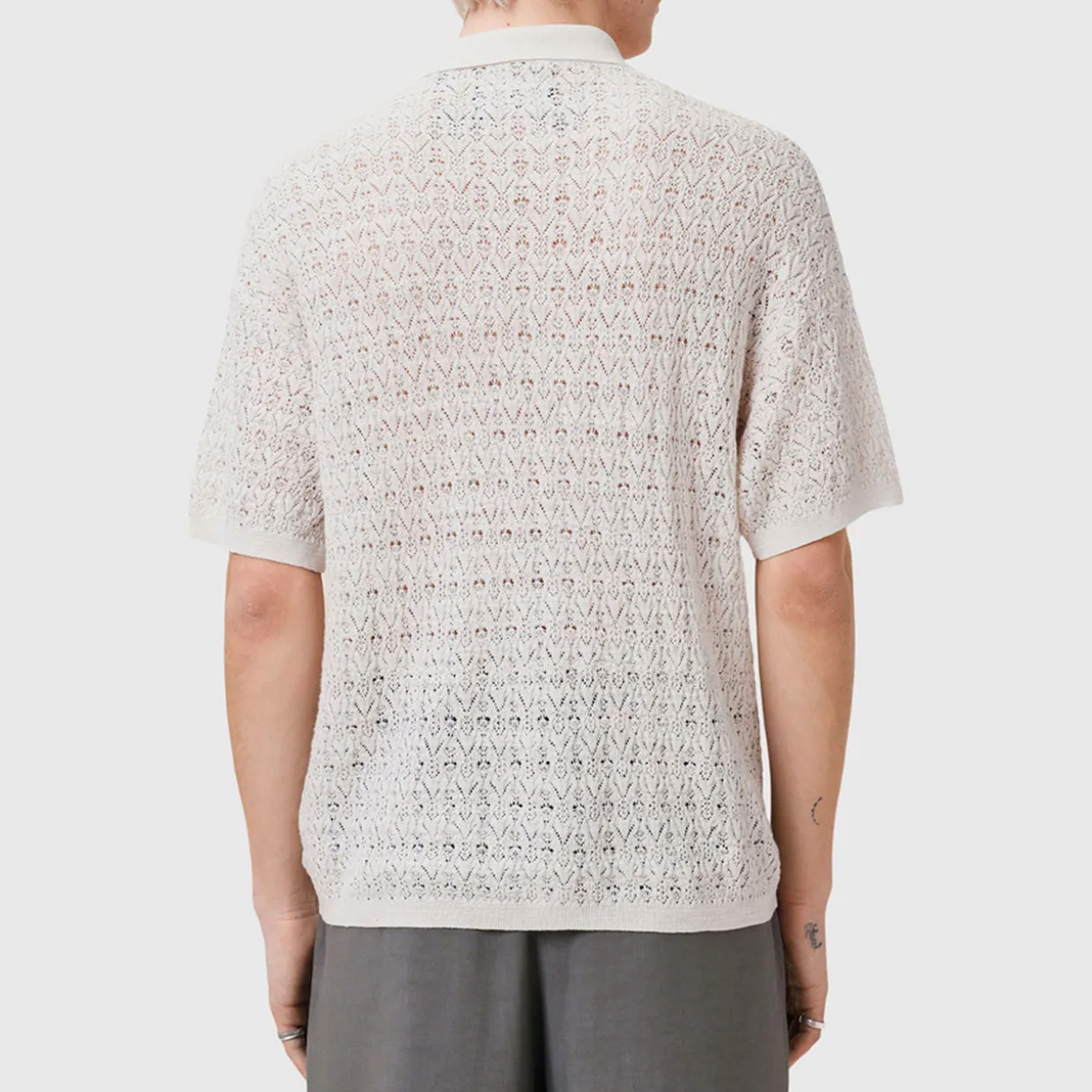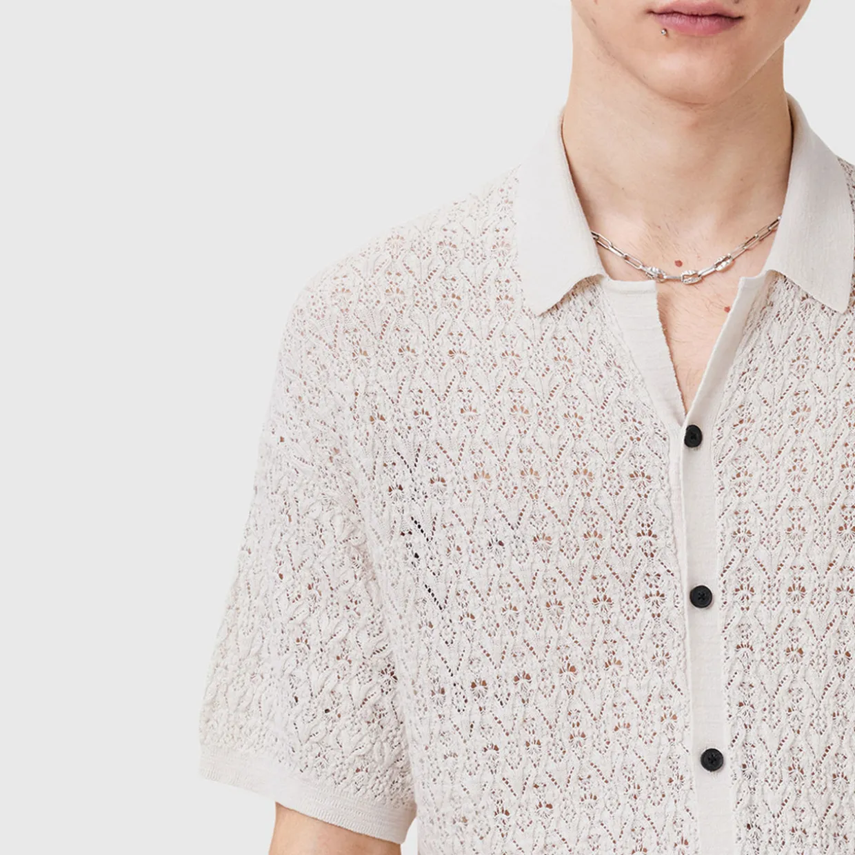- Hawaiian shirt style, button down cardigan, lightweight, open lace style stitch, ribbed trims