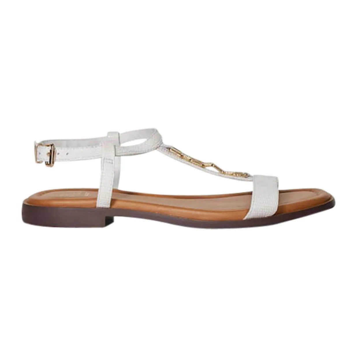- Mock-croc finish, T-bar design, ankle strap with buckle, open toe