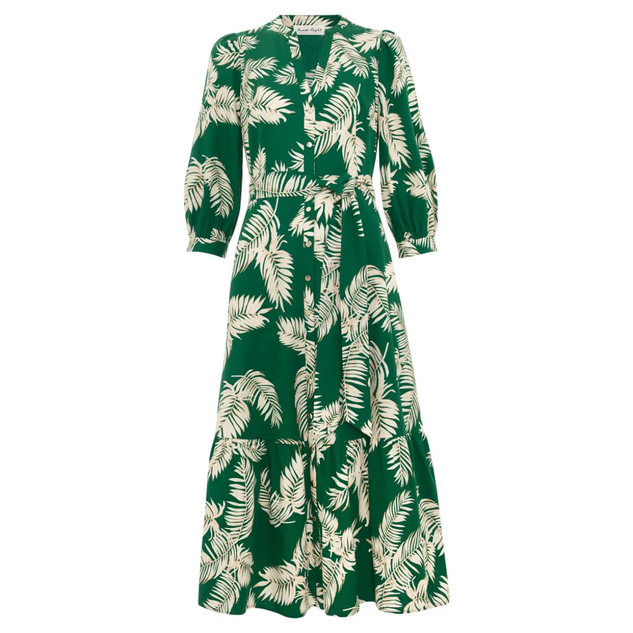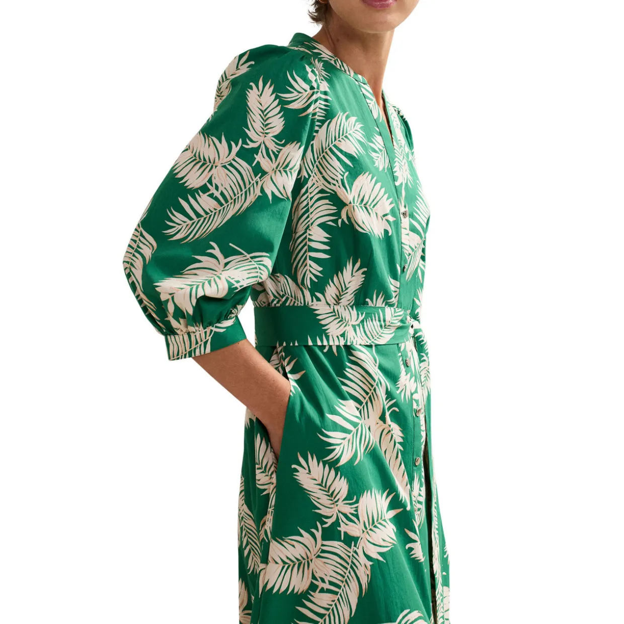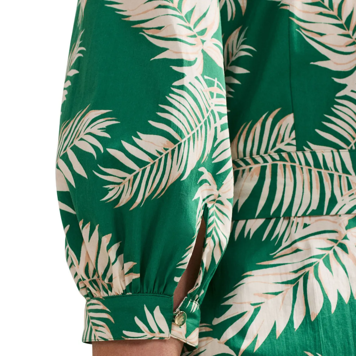 - Lightweight feel, midi length, palm print, cropped blouson sleeves, notched neckline, button fastenings