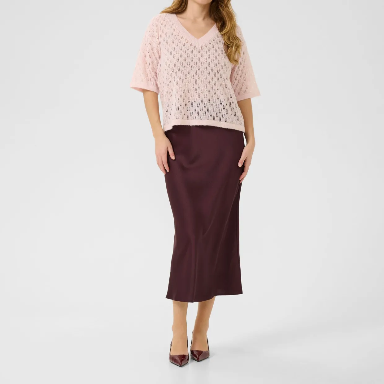 - V-neckline, knitted, pull-on style, short sleeves
