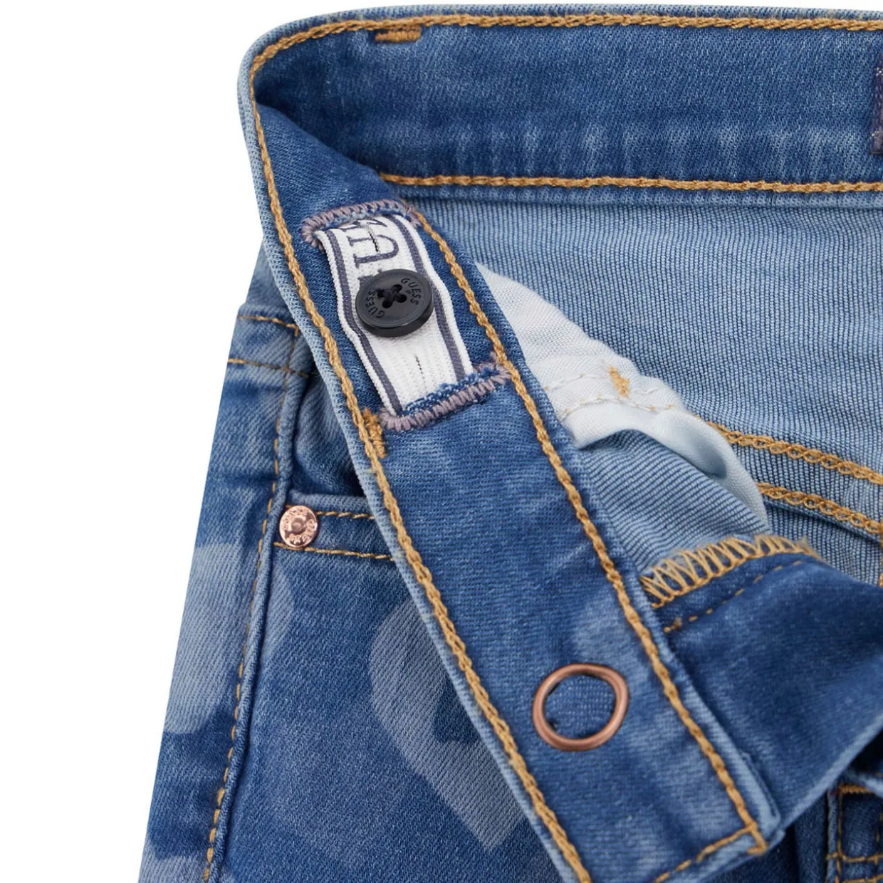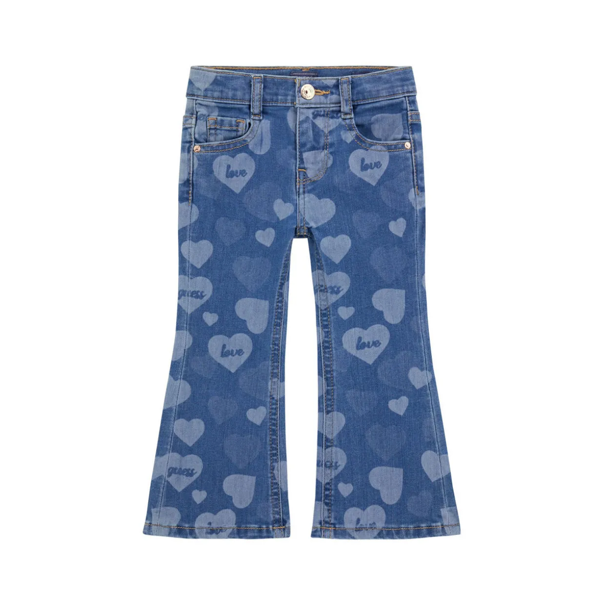 - Love heart print, flared silhouette, belt loops, five-pocket style, button and fly fastening, brand logo detail, triangle logo detail