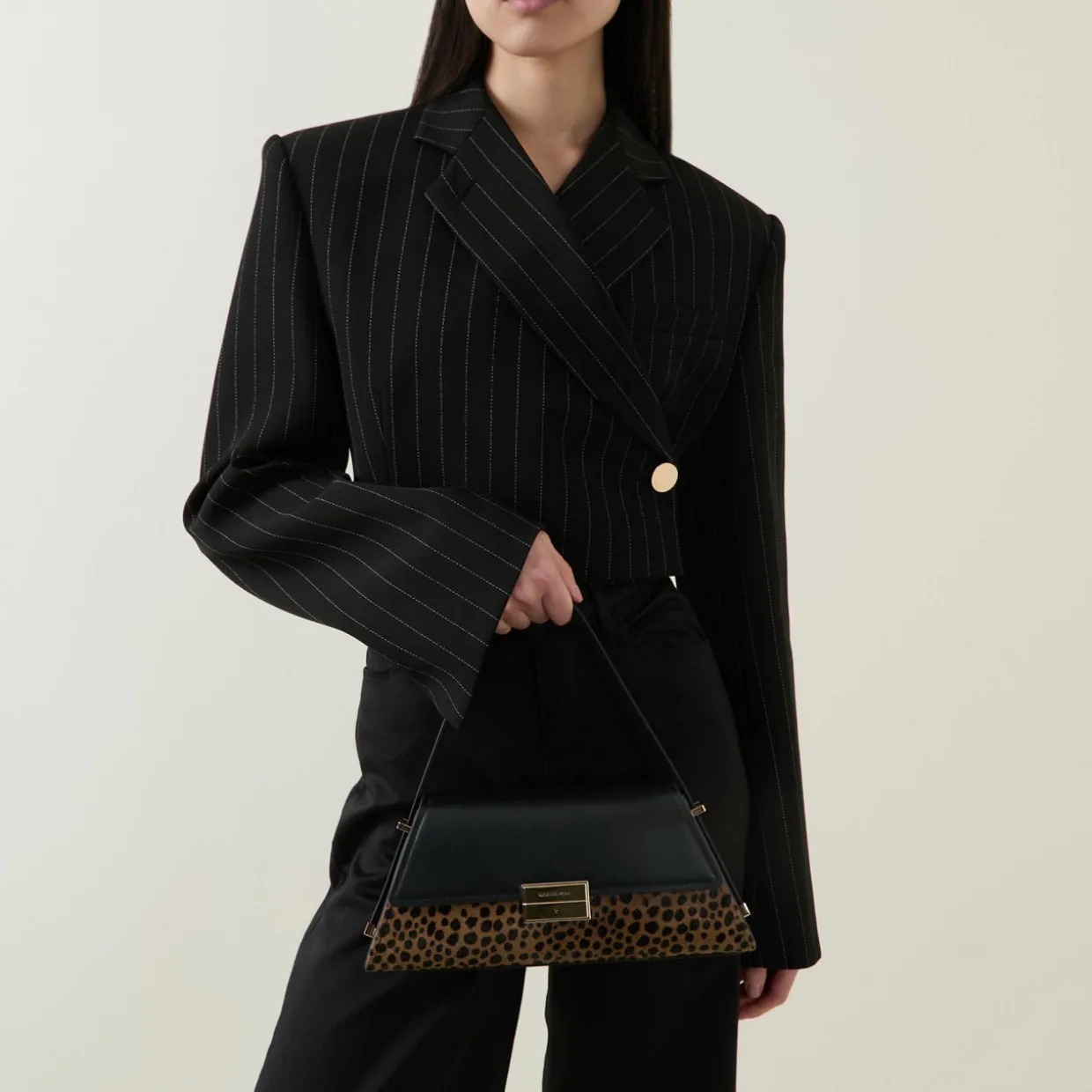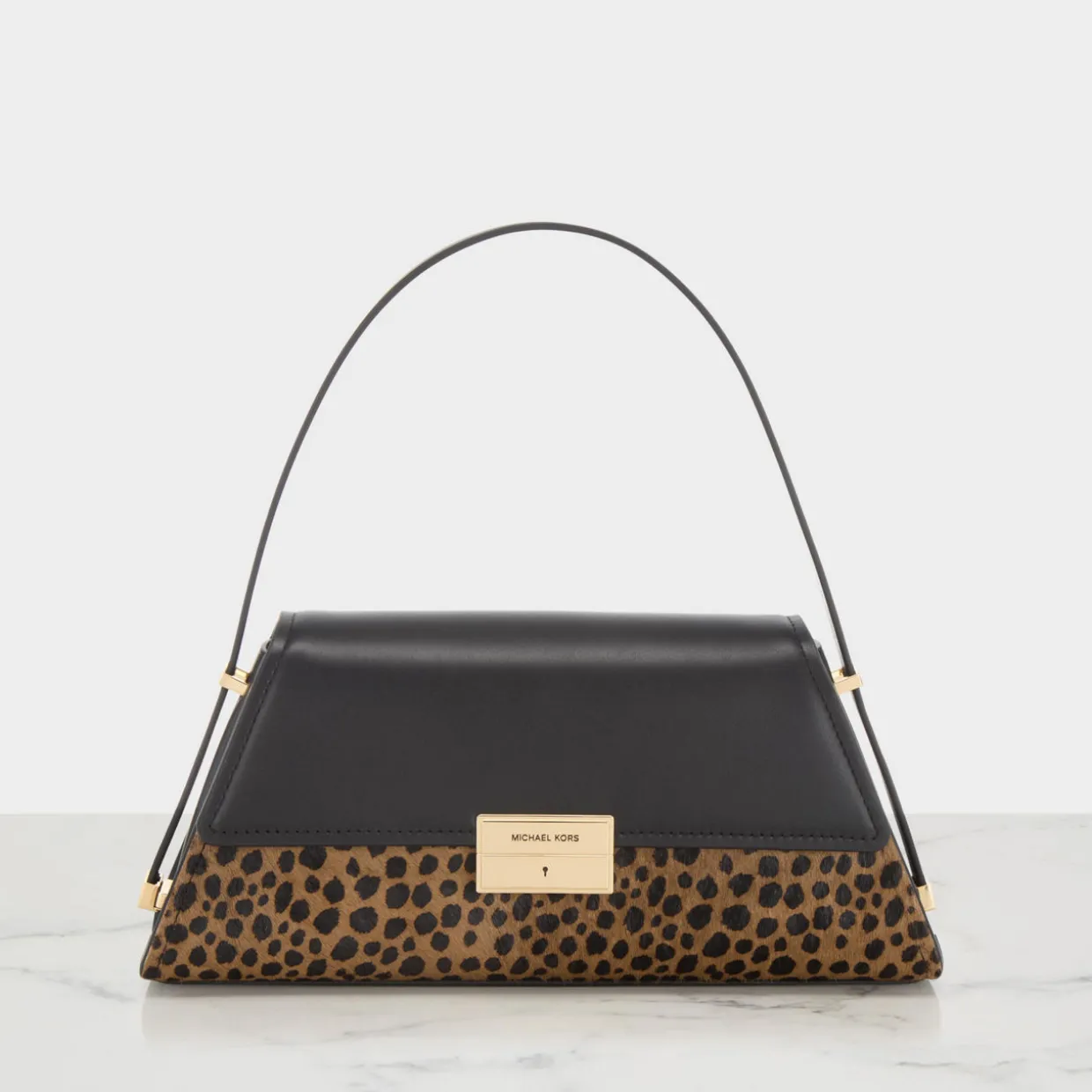 - Flap closure in smooth leather, clasp fastening with engraved logo detail, adjustable shoulder strap, gold-tone hardware, structured silhouette, textured leopard print finish
