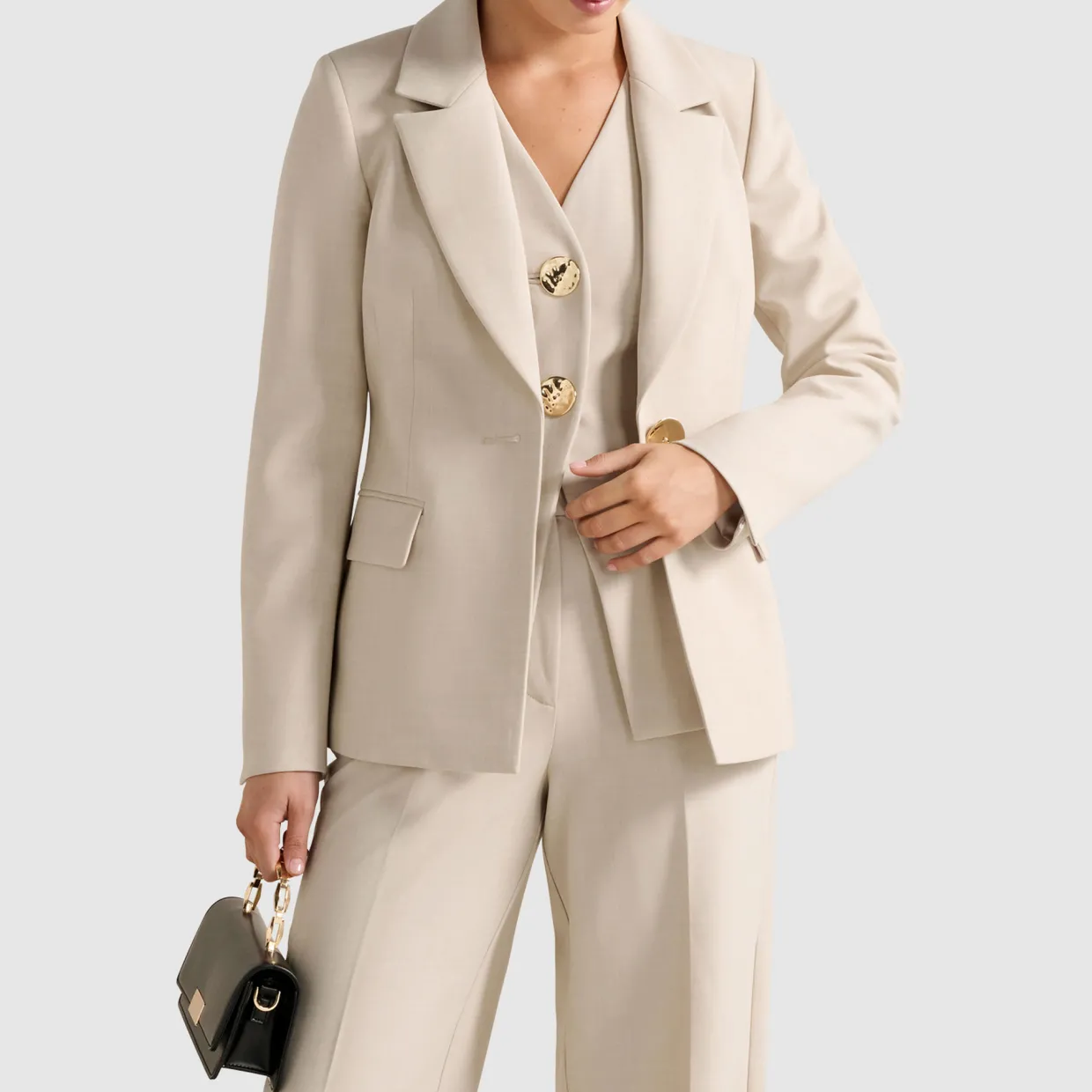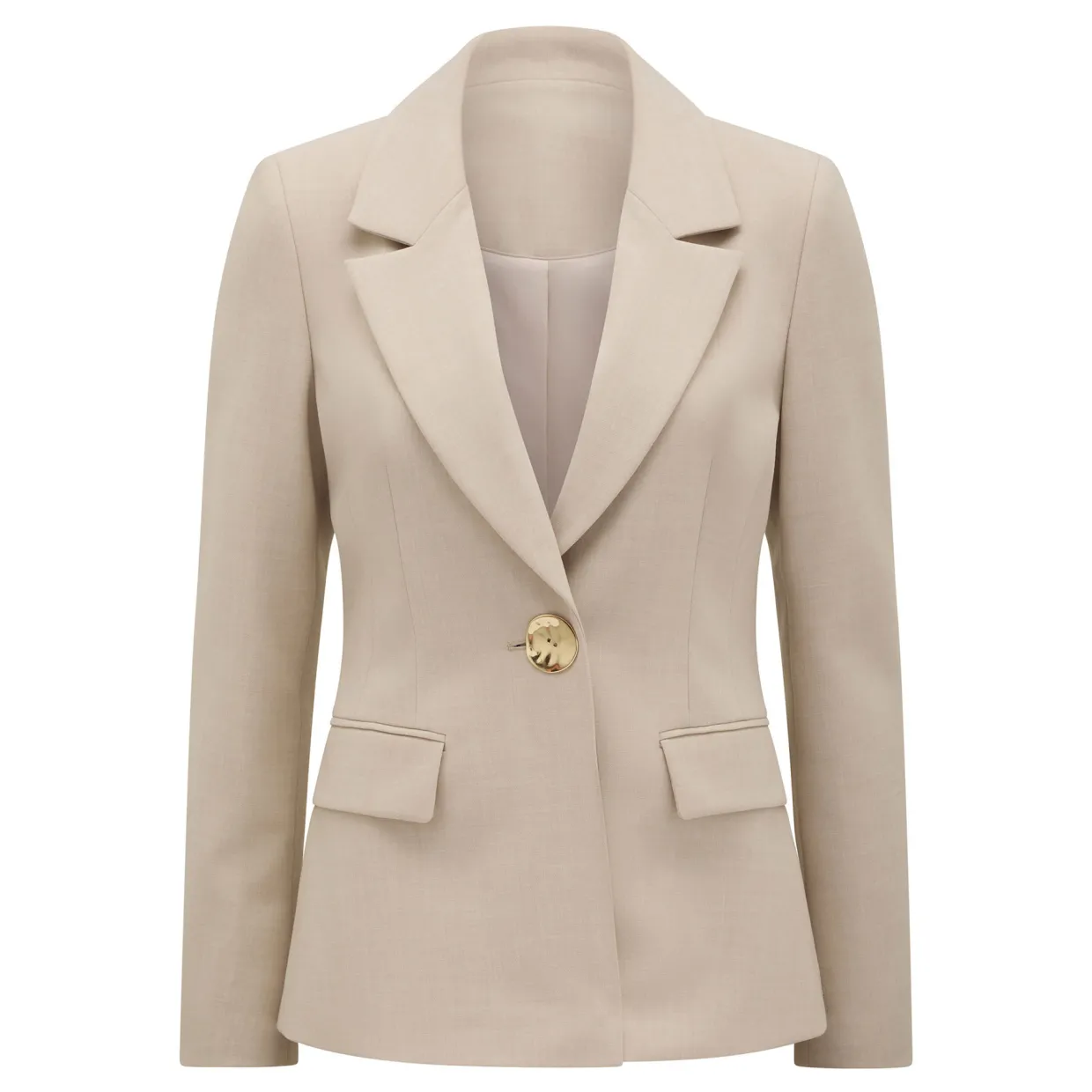- Gold-tone button, notched lapel collar, long sleeves, front flap pockets