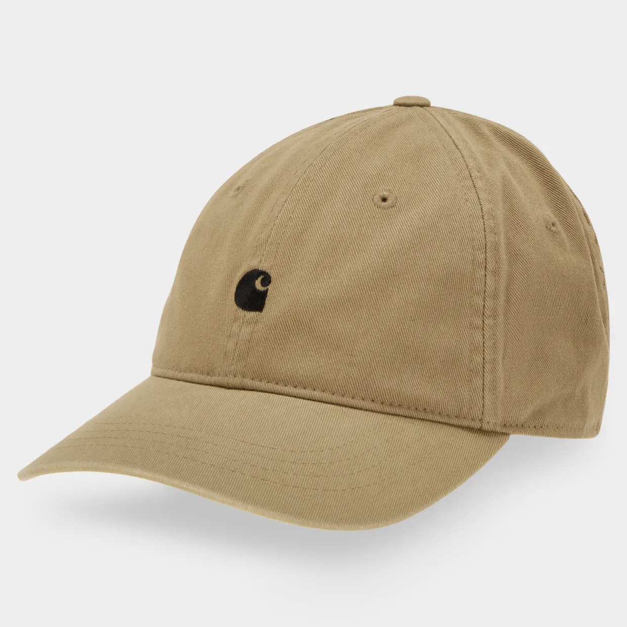 - Curved peak, unlined, twill fabrication, embroidered logo detail, eyelets, adjustable back, six-panel design
