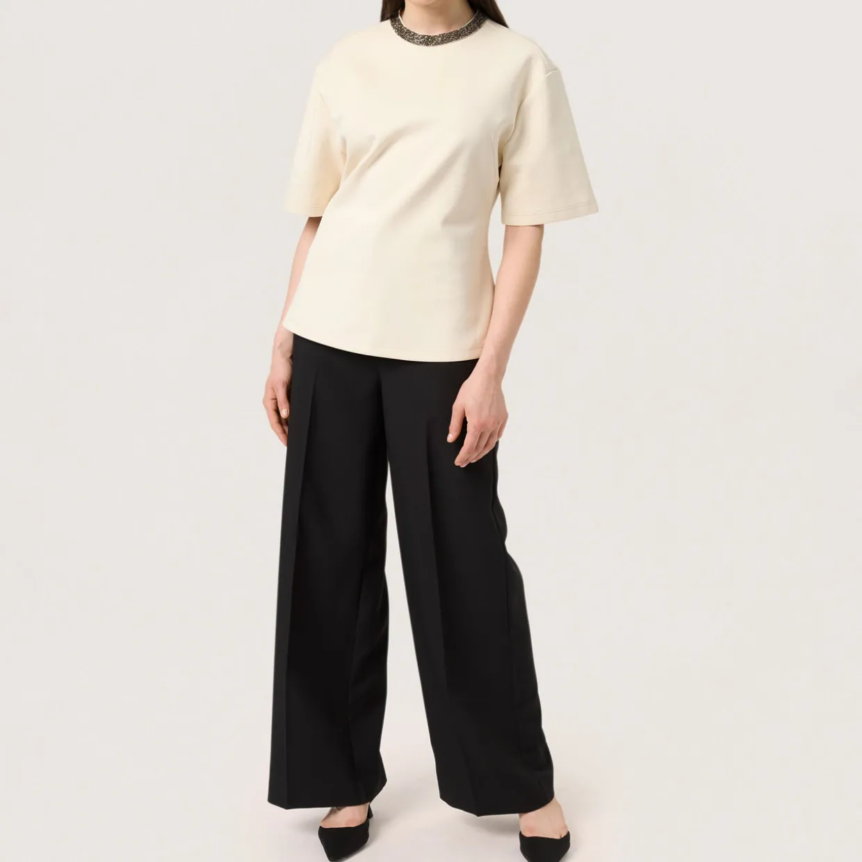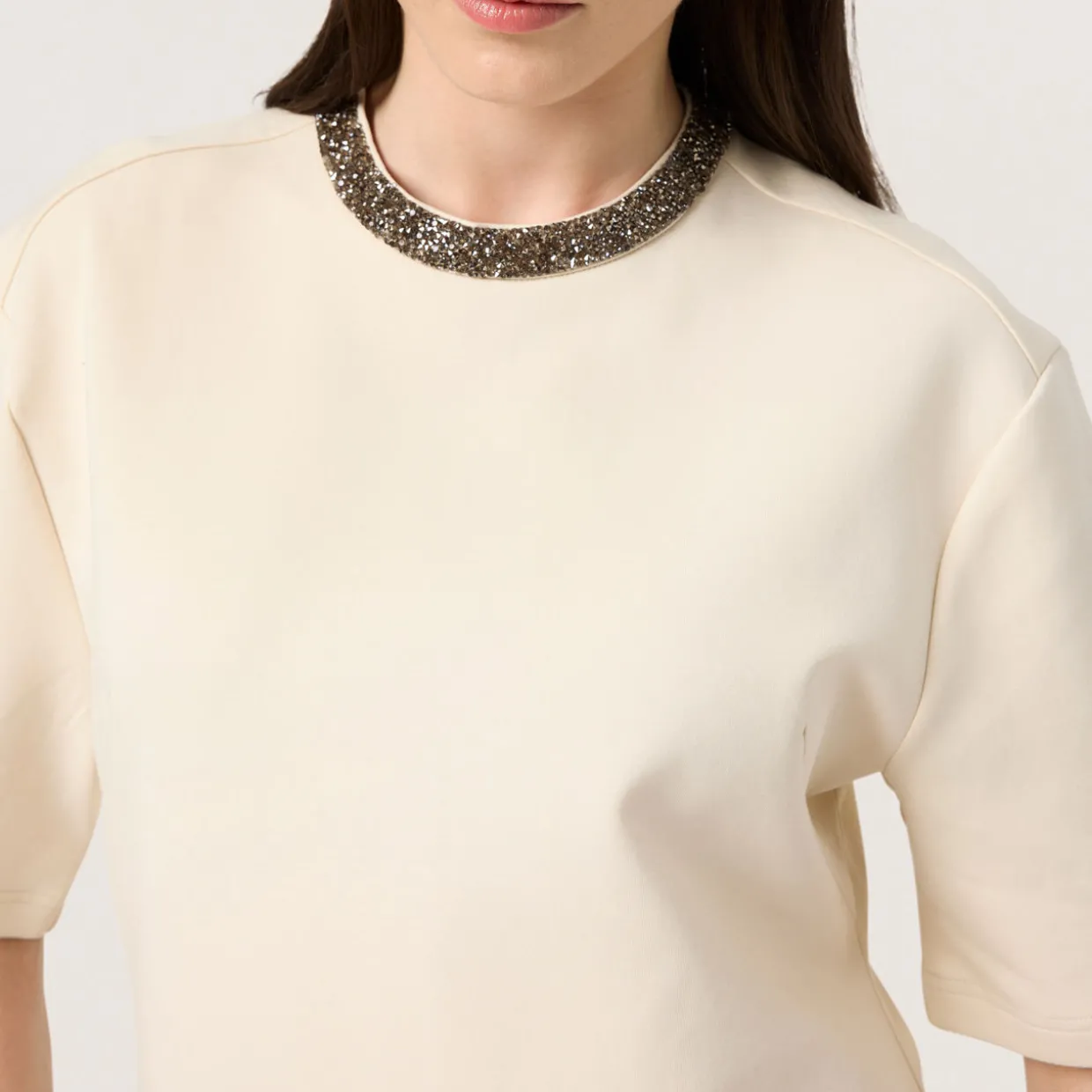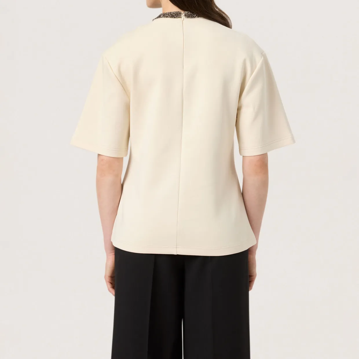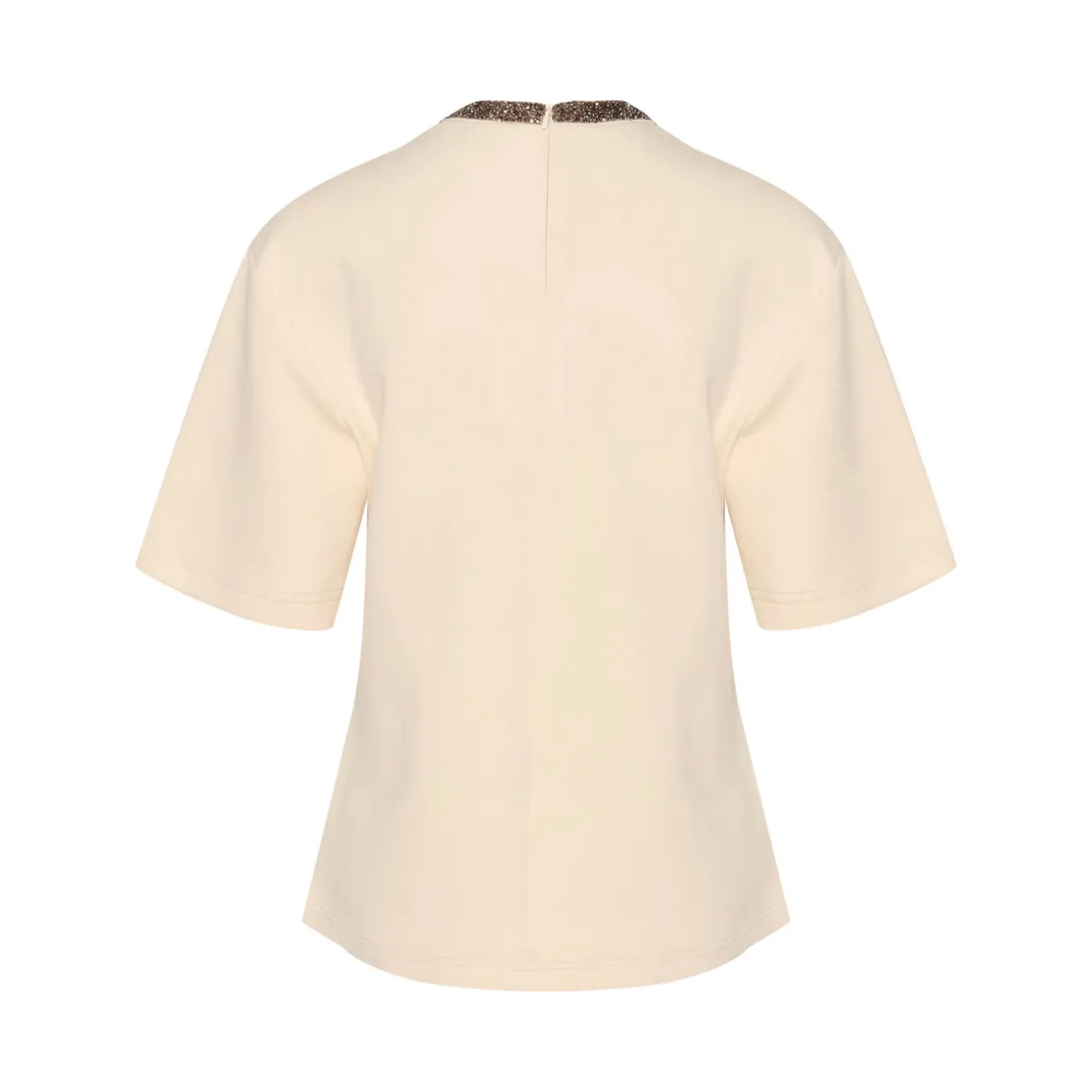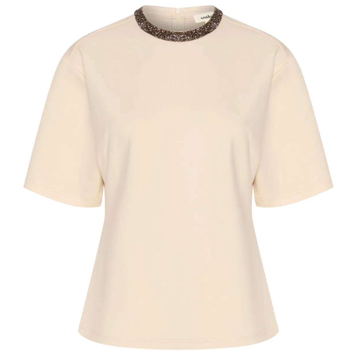 - Round neck with sequin embellished trim, short sleeves, back zip fastening