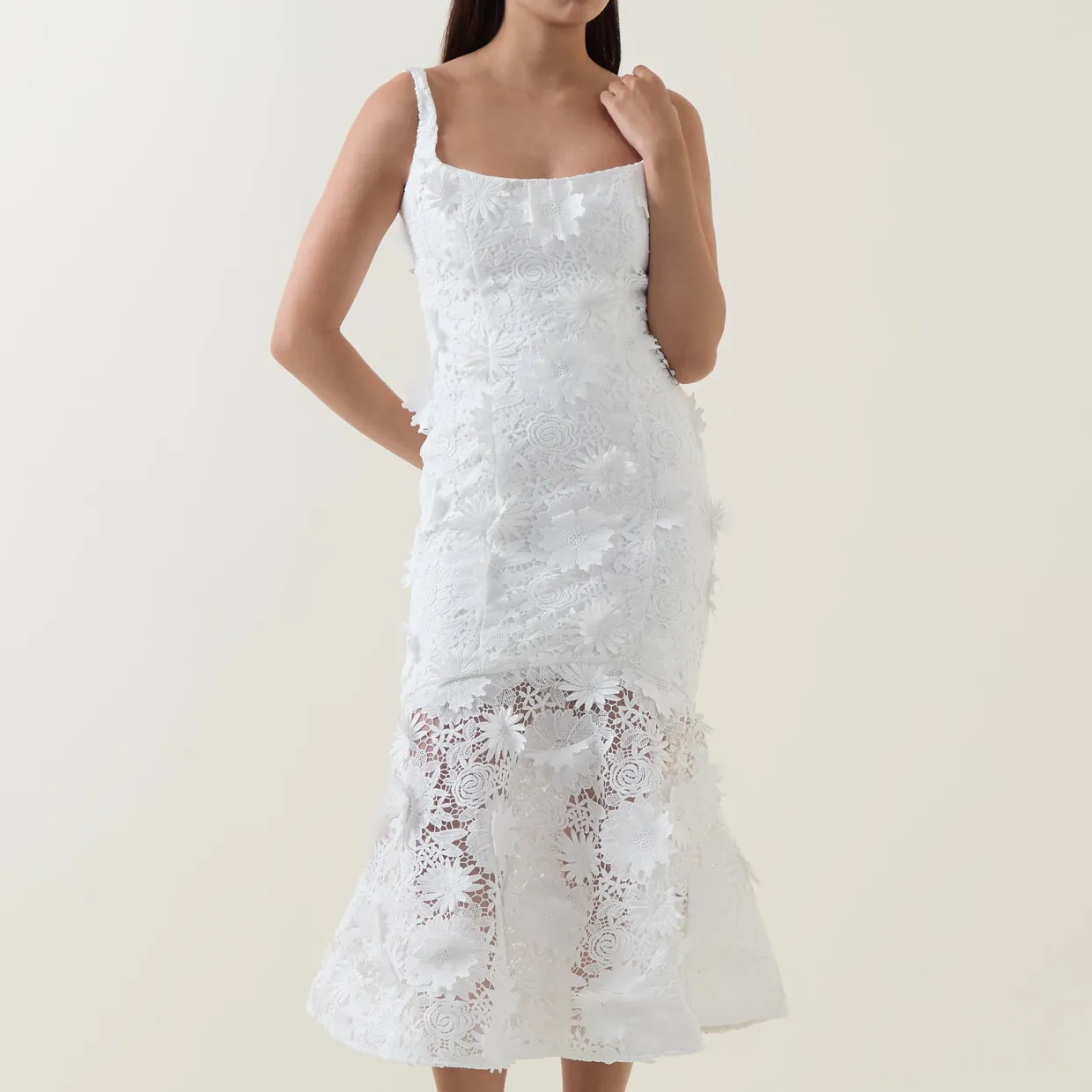 - Wide straps, sleeveless, square neckline, back zip-fastening closure, floral lace design, fitted silhouette, flared hemline, midi length, textured finish