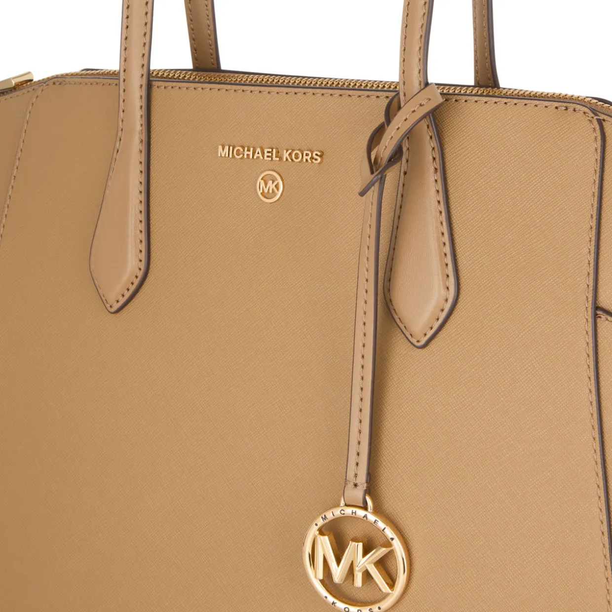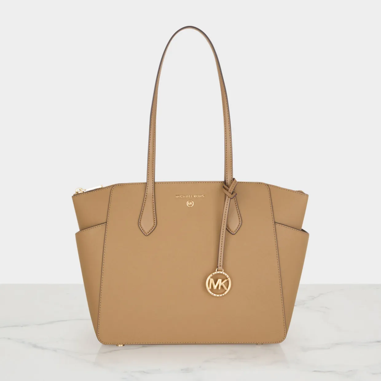 - Top carry handles, top-zip fastening, two side pockets, gold-tone hardware, protective studs at base, detachable branded charm