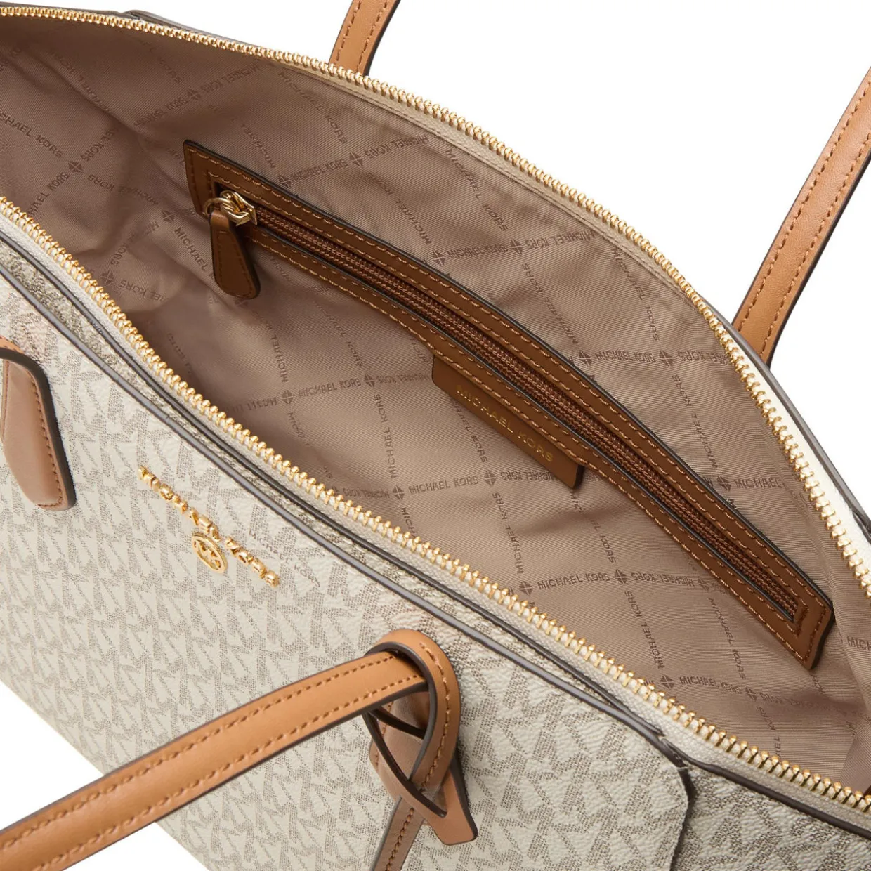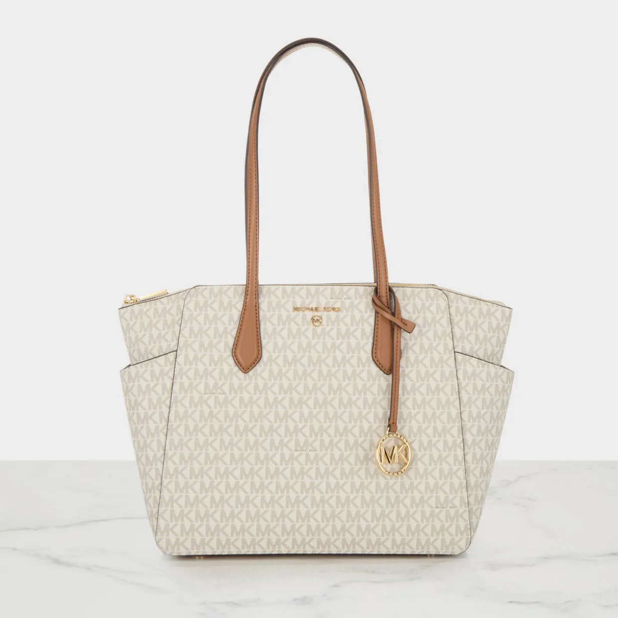 - Top carry handles, top-zip fastening, two side pockets, gold-tone hardware, protective studs at base, detachable branded charm, monogram logo print