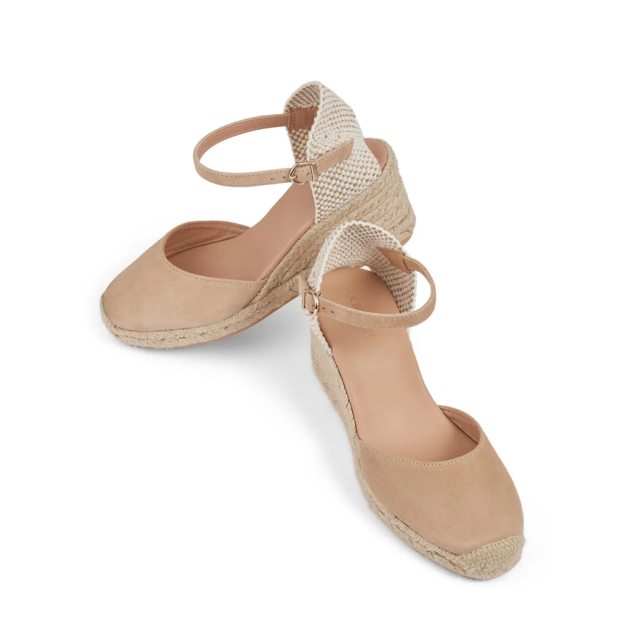 - Rope wedge sole, round suede toe, ankle strap, gold-tone buckle fastening, canvas back