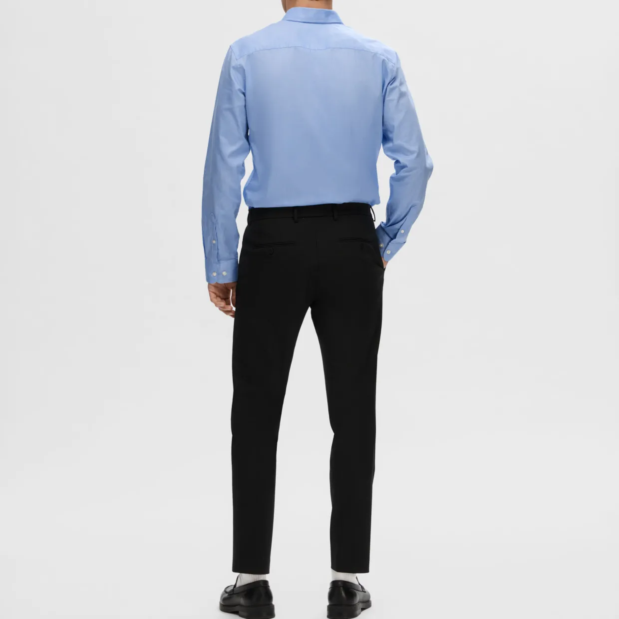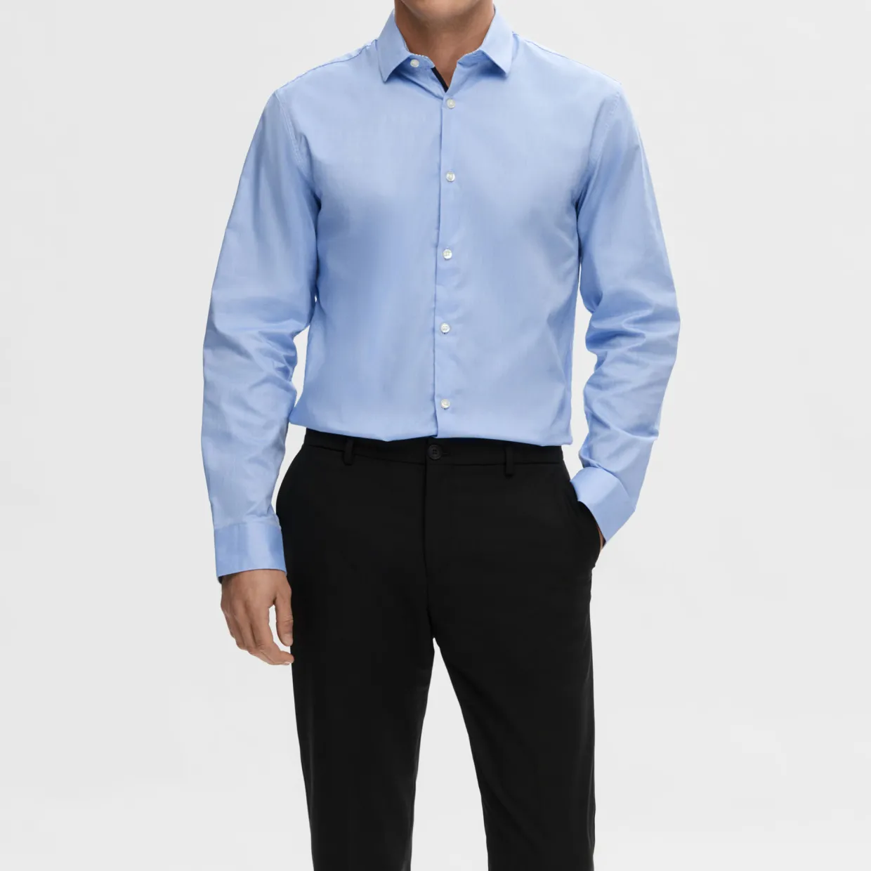 - Button fastening, shirt collar, long sleeves, buttoned cuffs, curved hem, unlined
