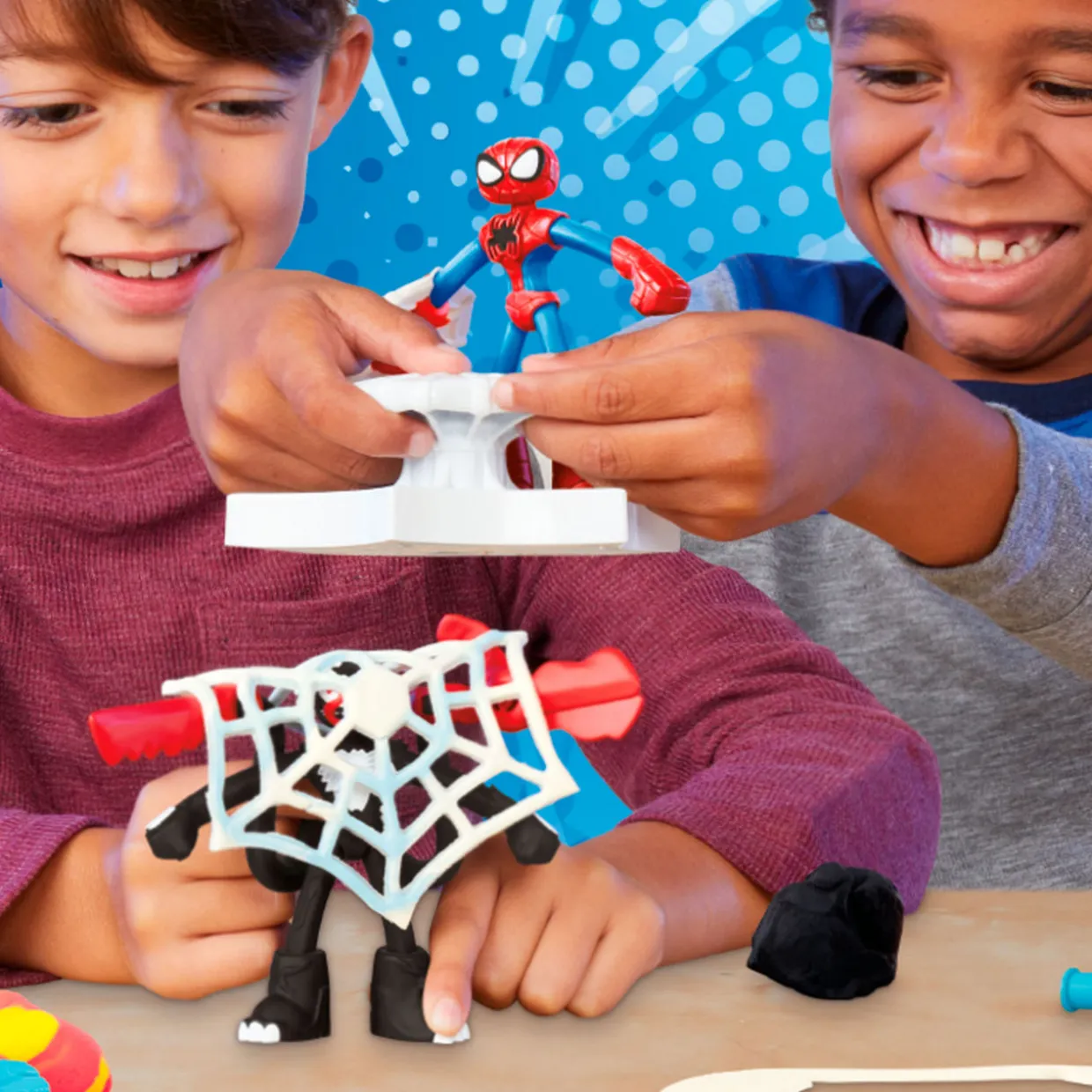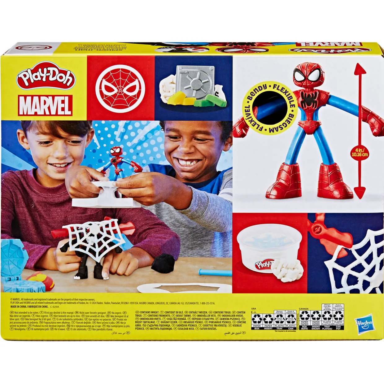 - Set includes a selection of storytelling accessories, including: Two bendy figures, three attachable tools, one web launcher, one web shield mould, one safe mould, one roller, and four pots of Play-Doh