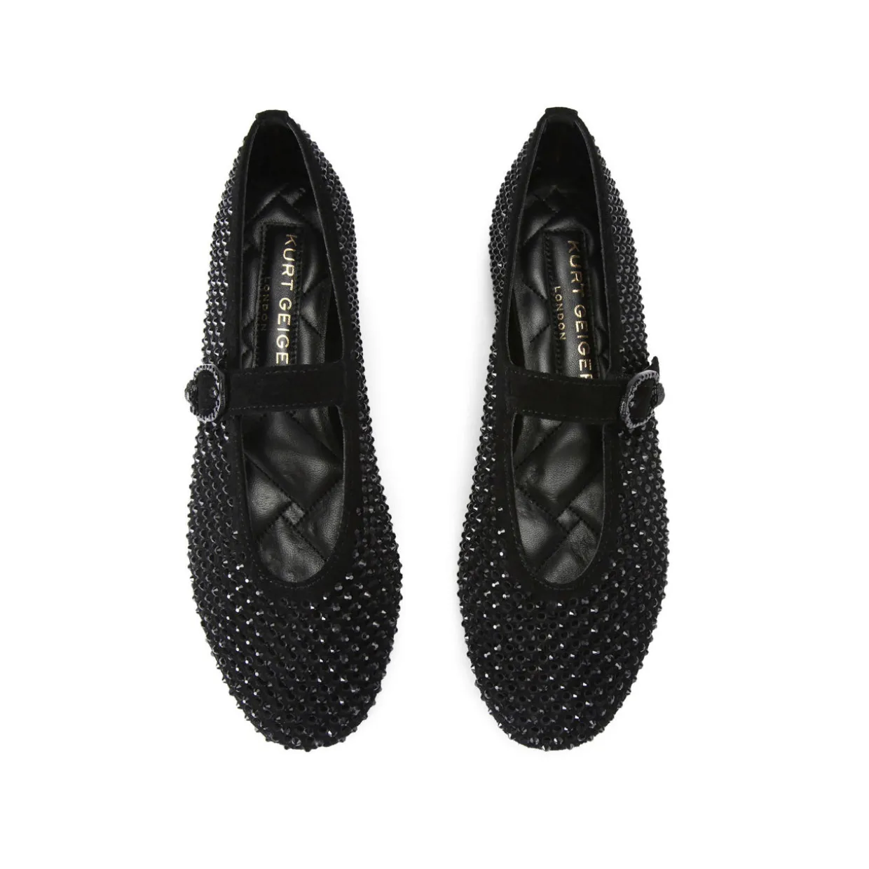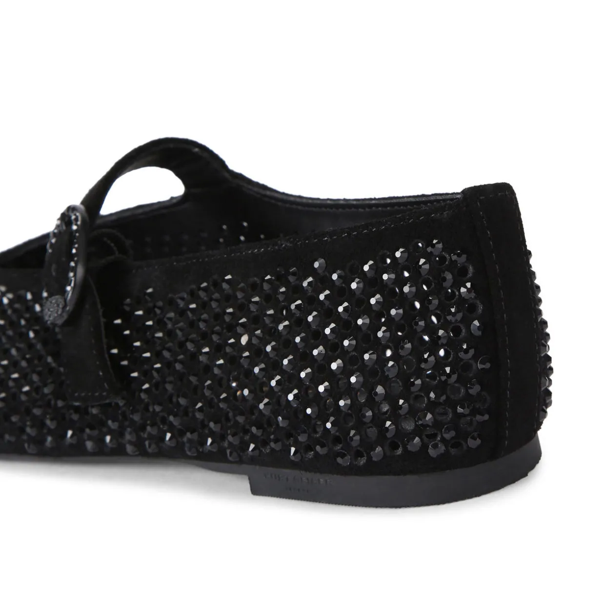 - Crystal-embellished suede upper, perforated holes, round toe, strap with embellished buckle