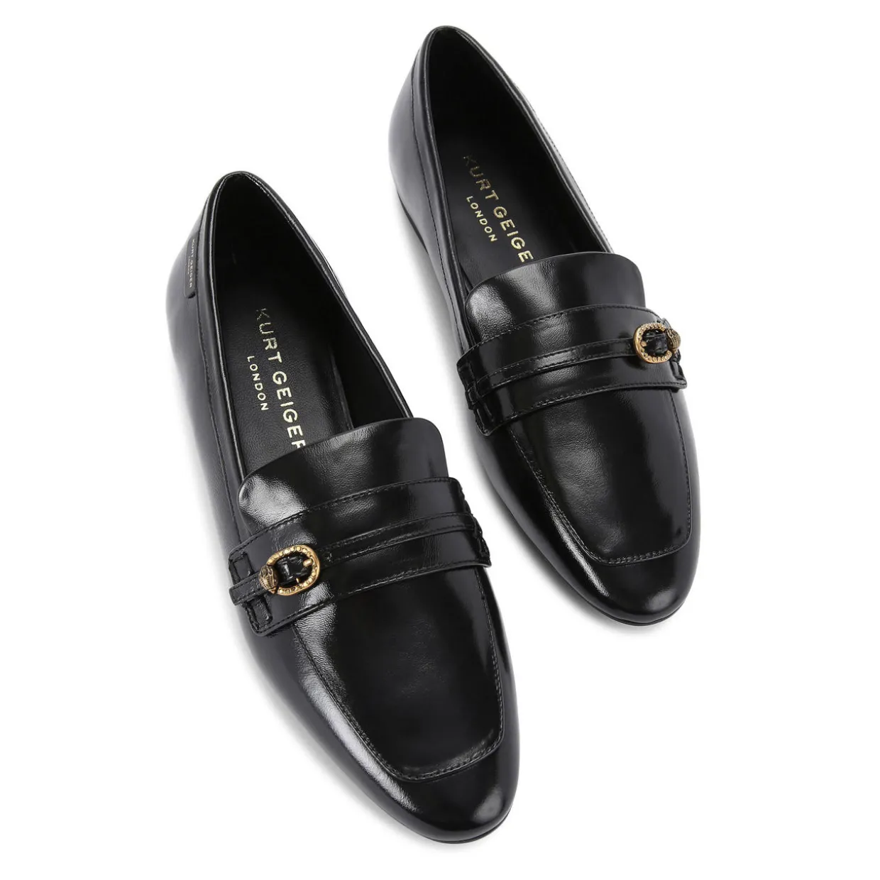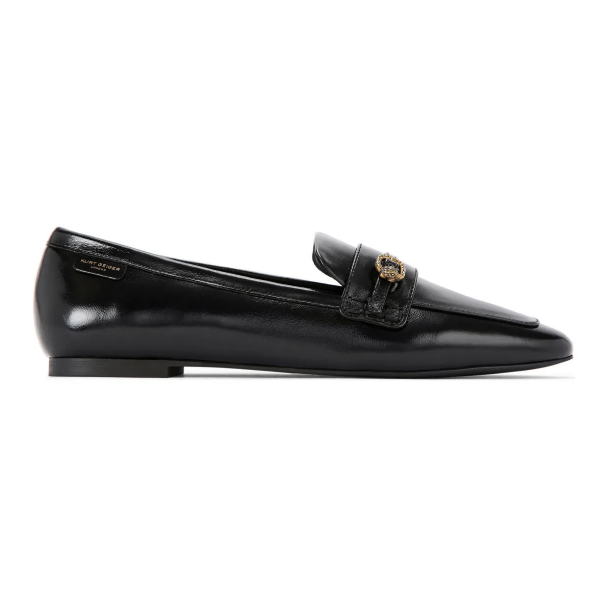 - Leather upper, almond toe, strap detail, antiqued brass buckle, eagle head stud, slip-on style